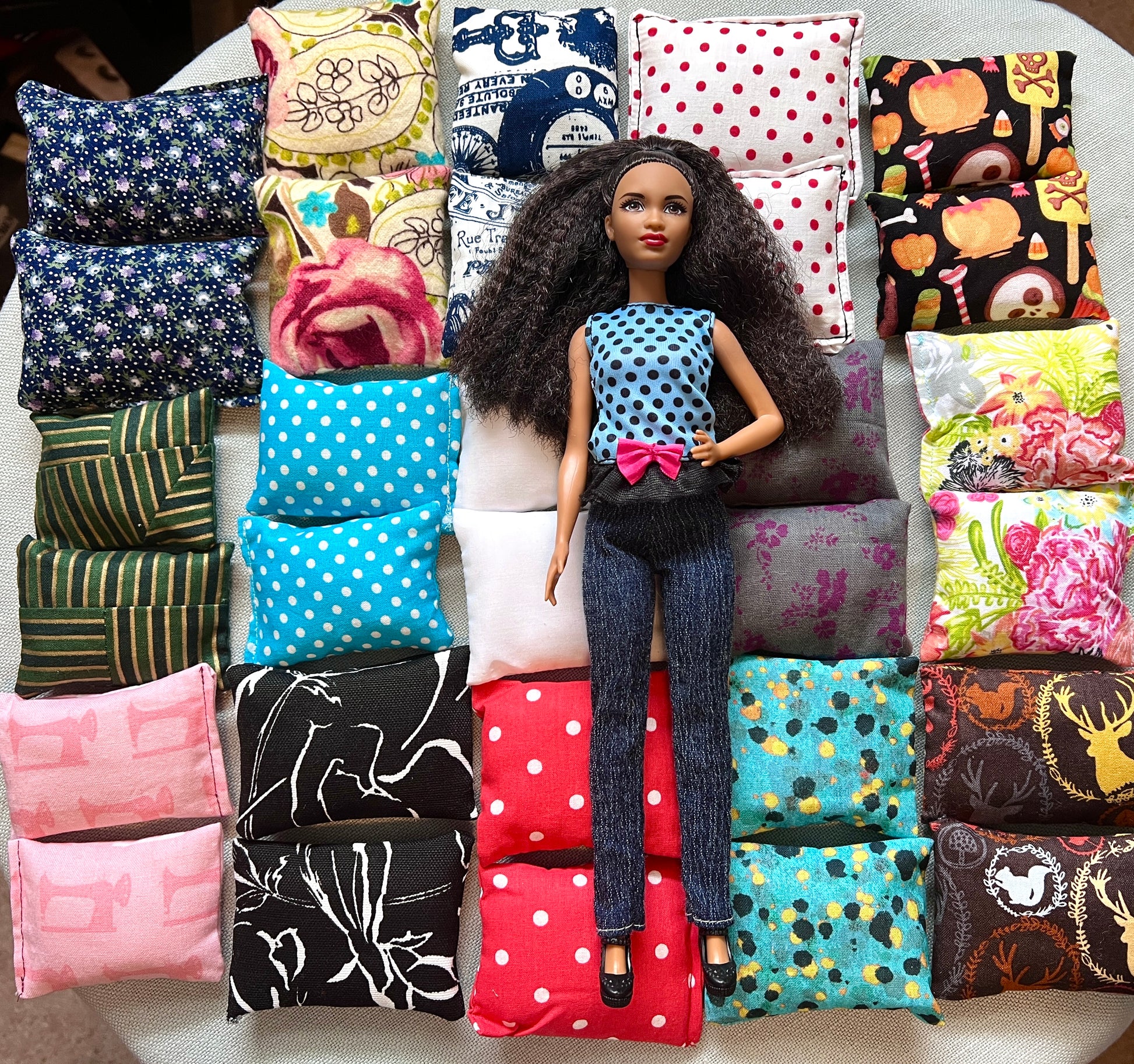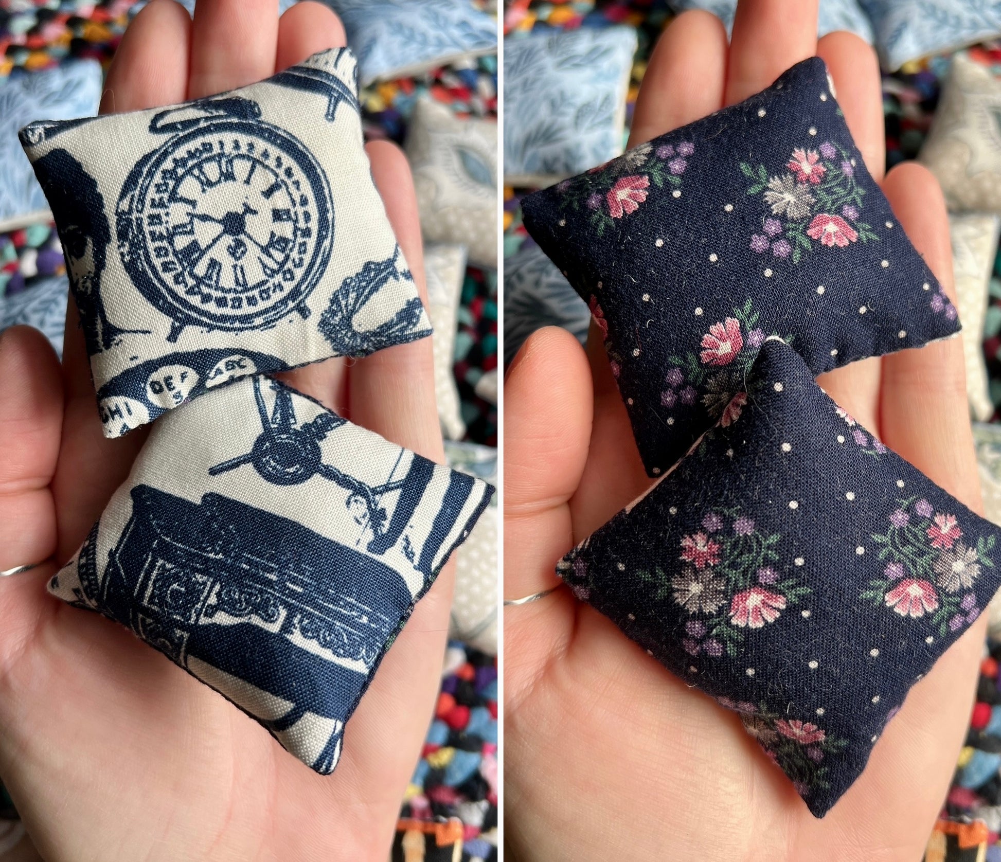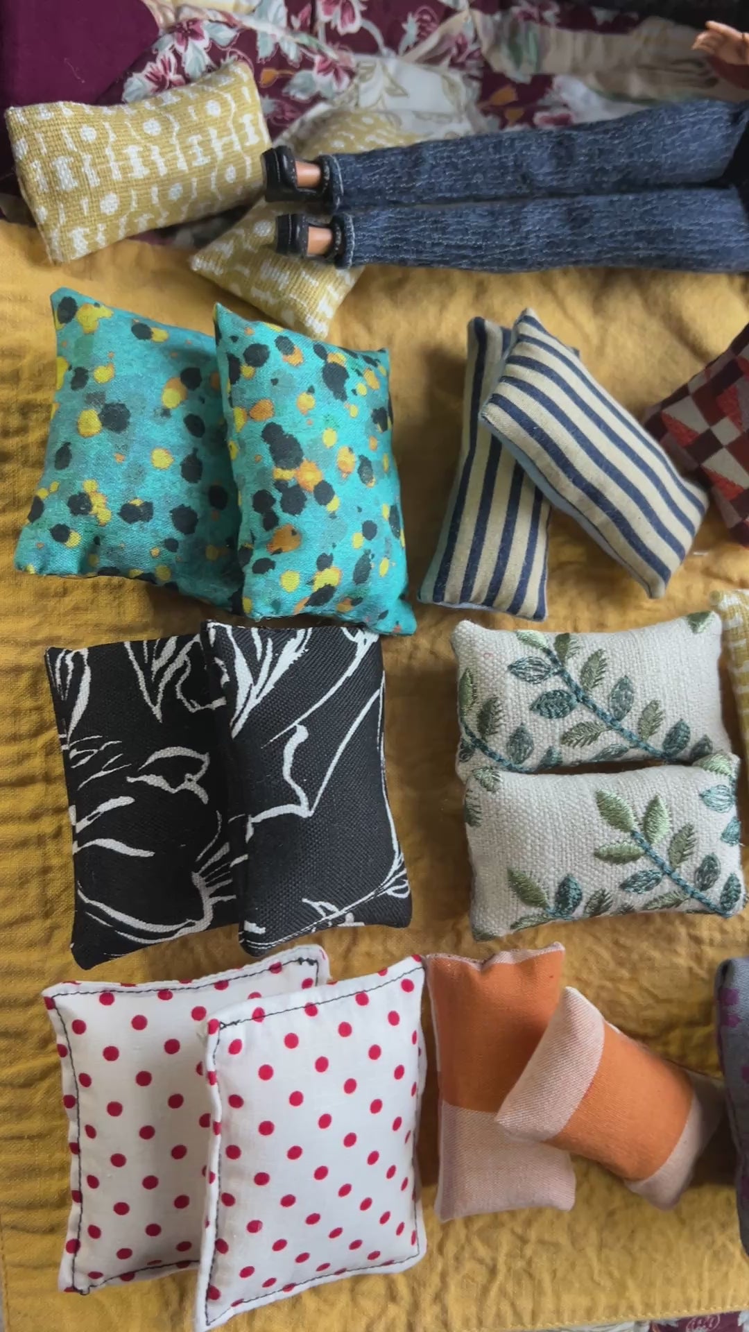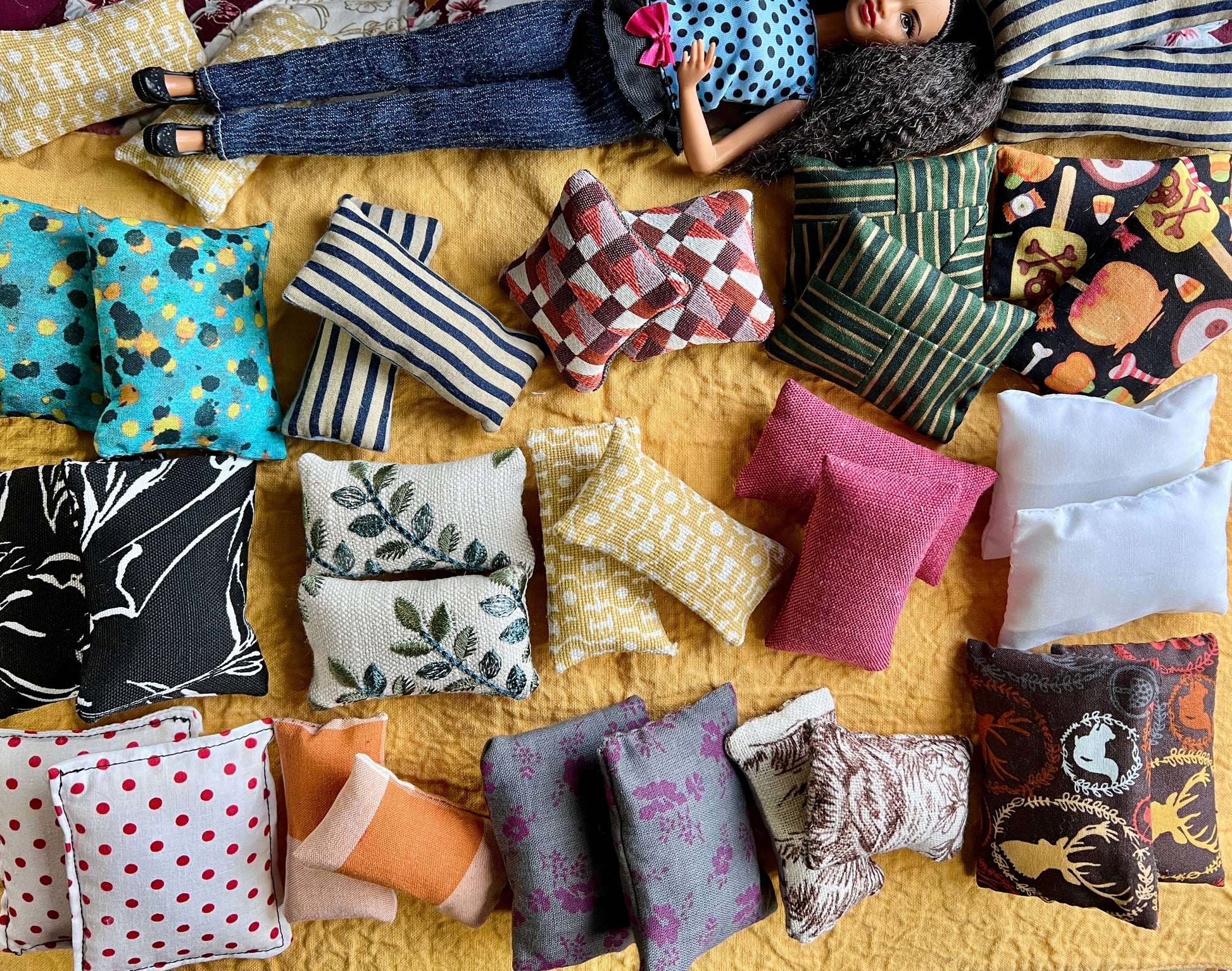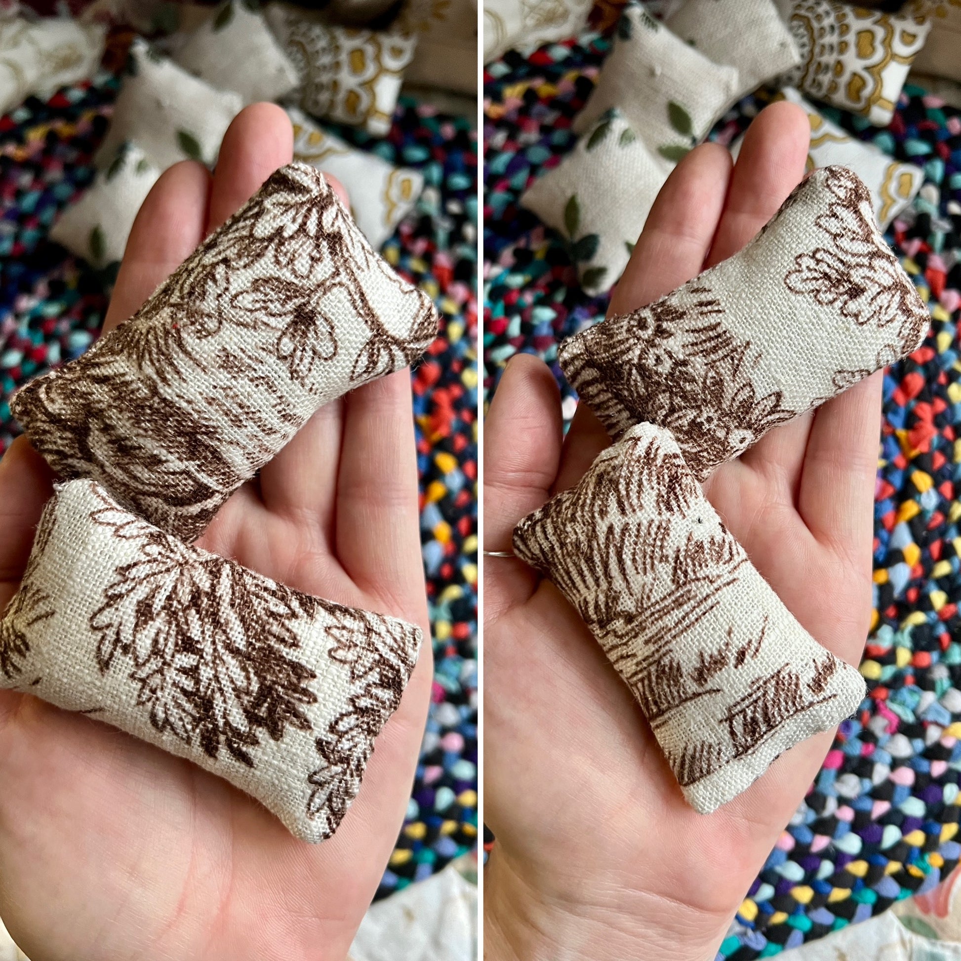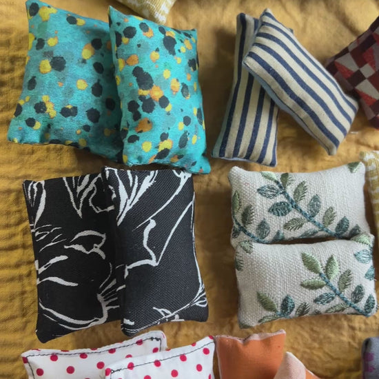 This is a listing for a pair of one-of-a-kind, miniature pillows! These are perfect for Barbie, 1:6 scale dollhouses! Unique doll cushions, utilitizing scrap fabrics. Hand stuffed with foam and polyfil to retain shape and plushness. Hand sewn closed, or edge-sewn, for a seamless design.