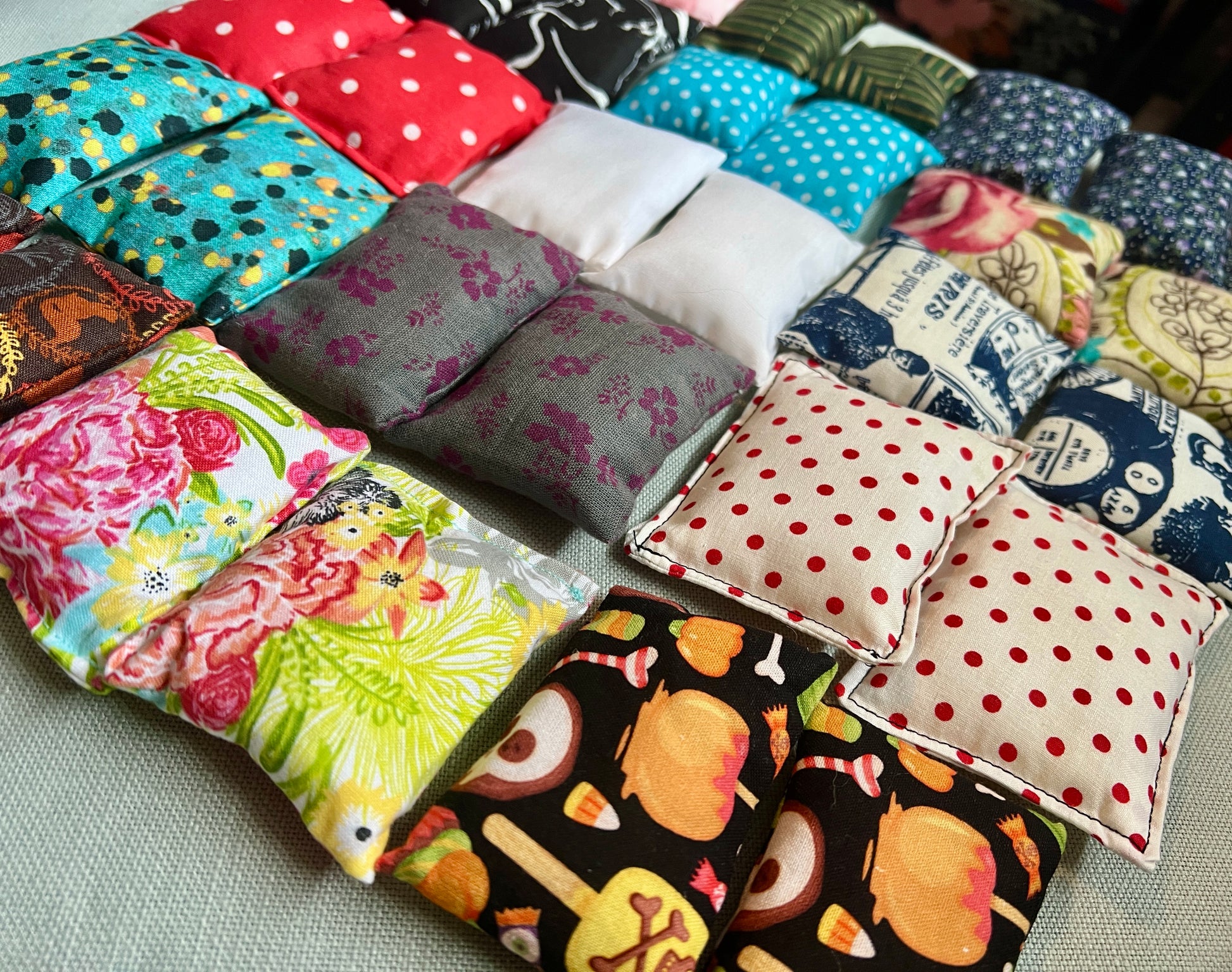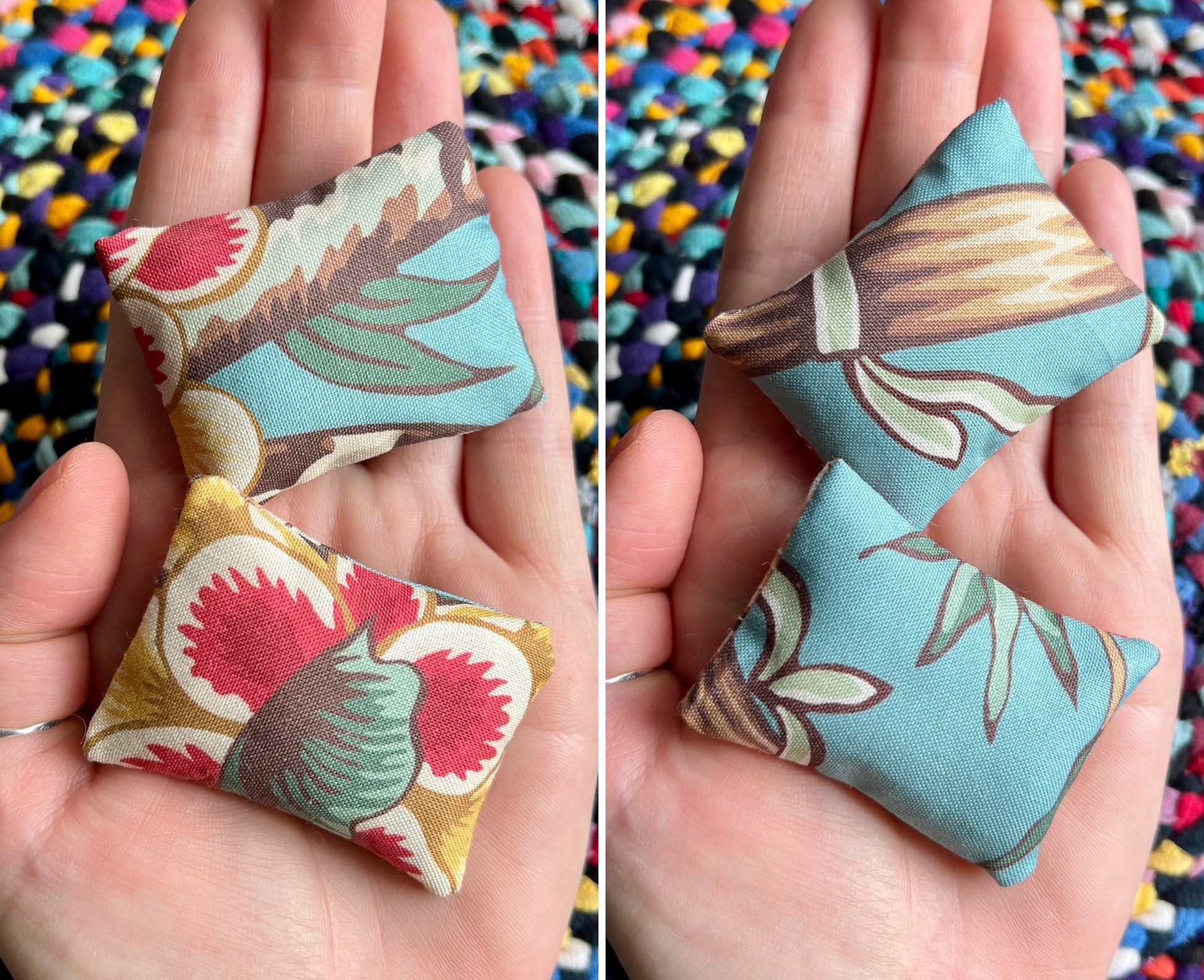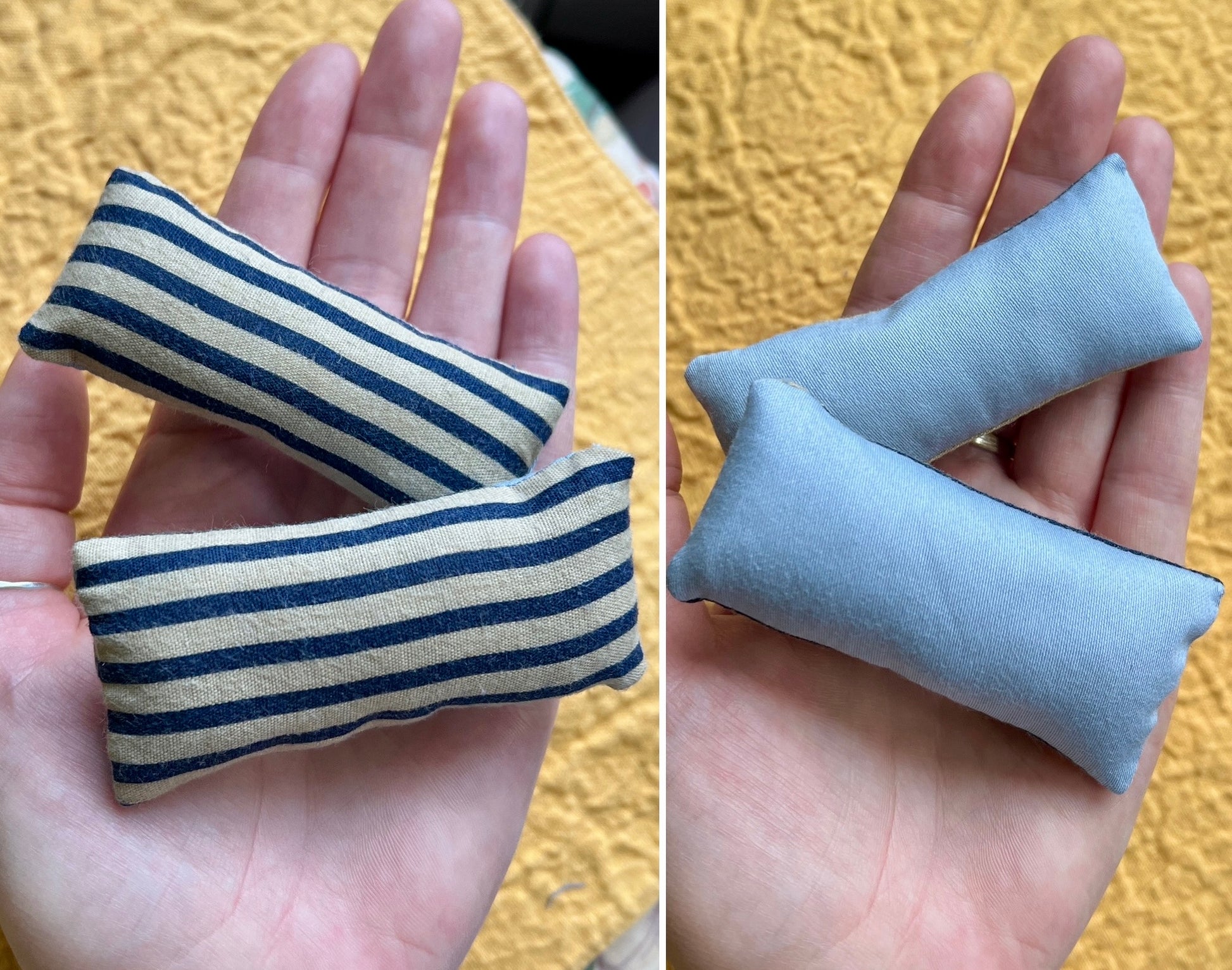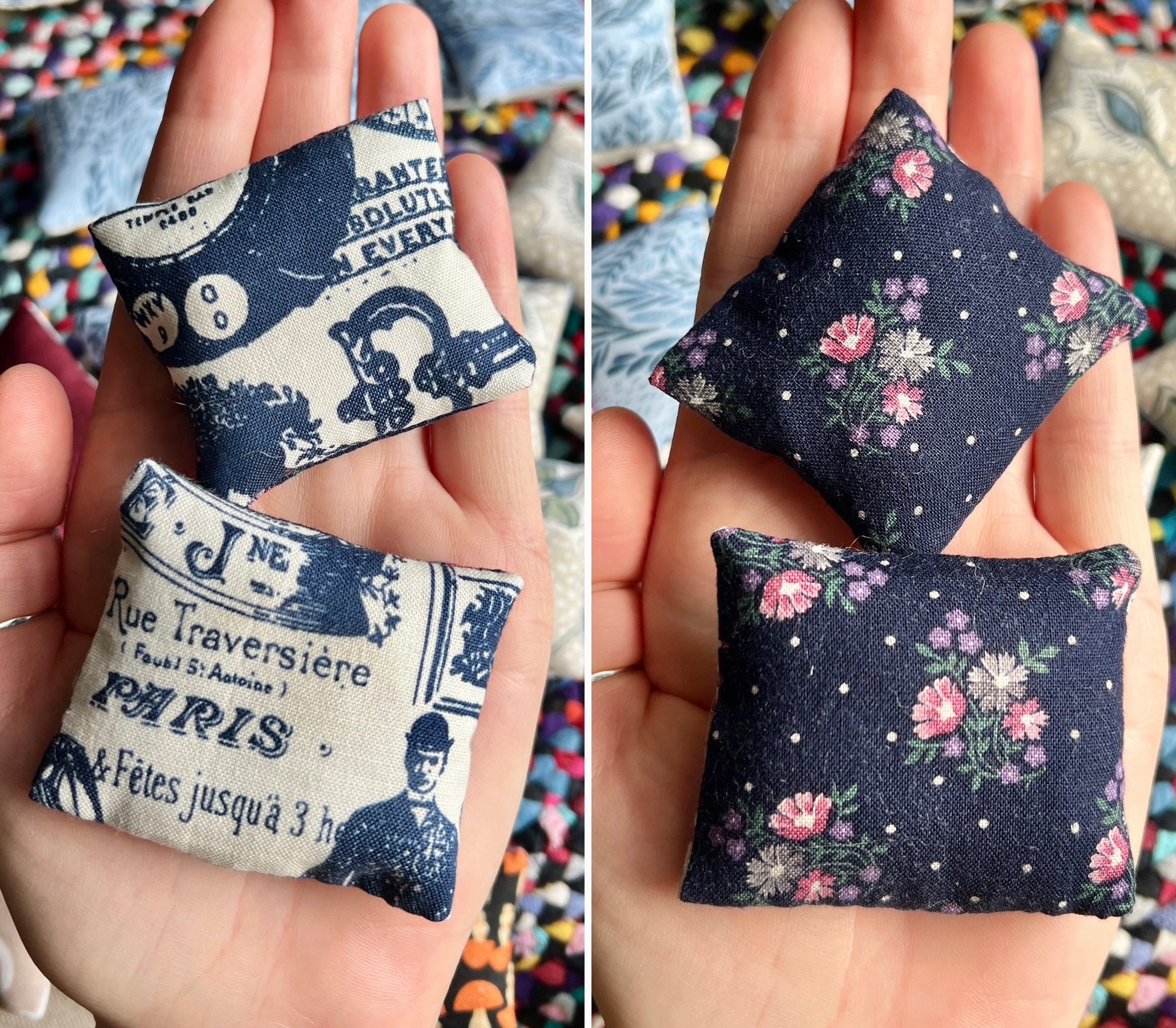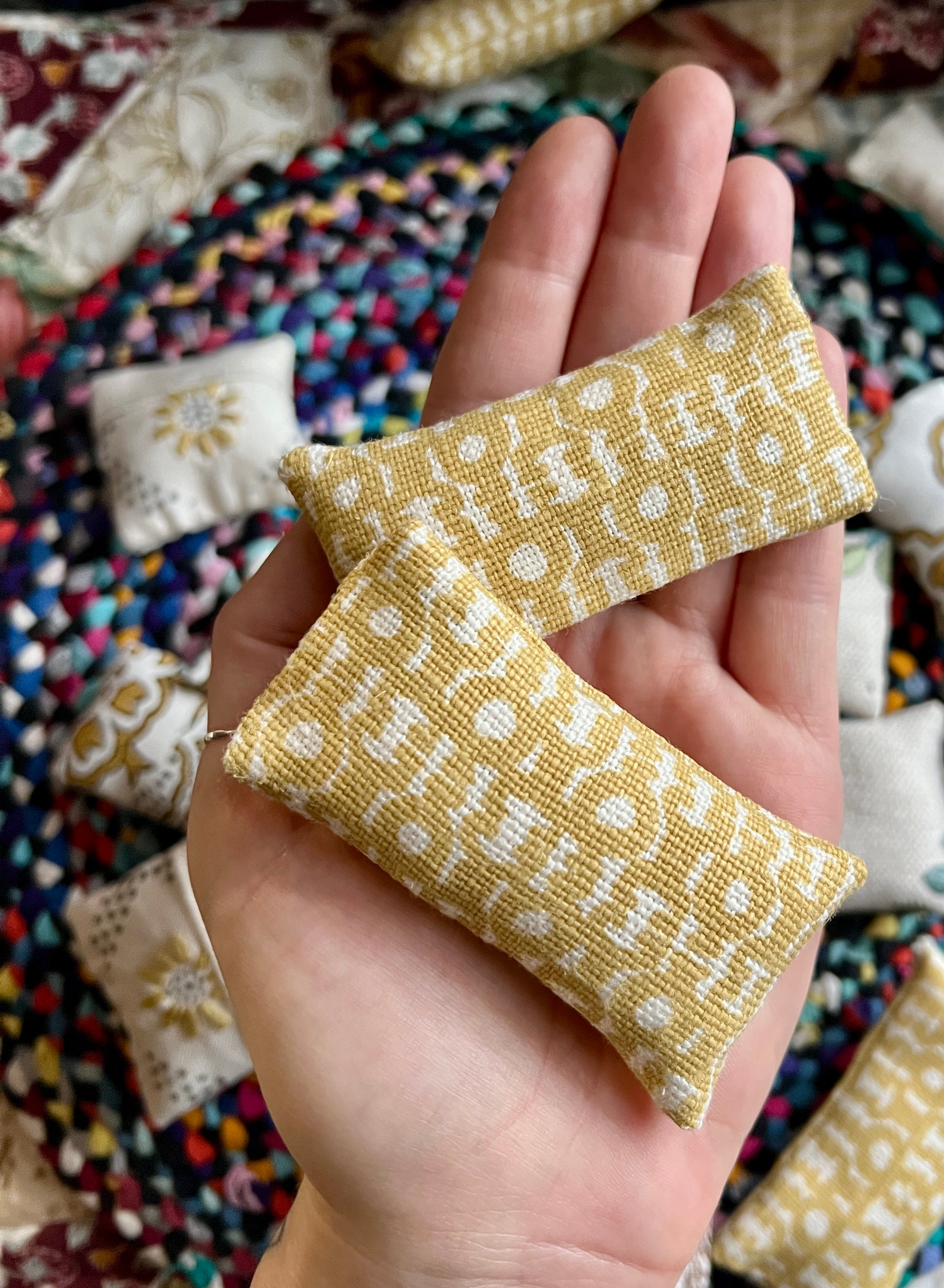 This is a listing for a pair of one-of-a-kind, miniature pillows! These are perfect for Barbie, 1:6 scale dollhouses! Unique doll cushions, utilitizing scrap fabrics. Hand stuffed with foam and polyfil to retain shape and plushness. Hand sewn closed, or edge-sewn, for a seamless design.