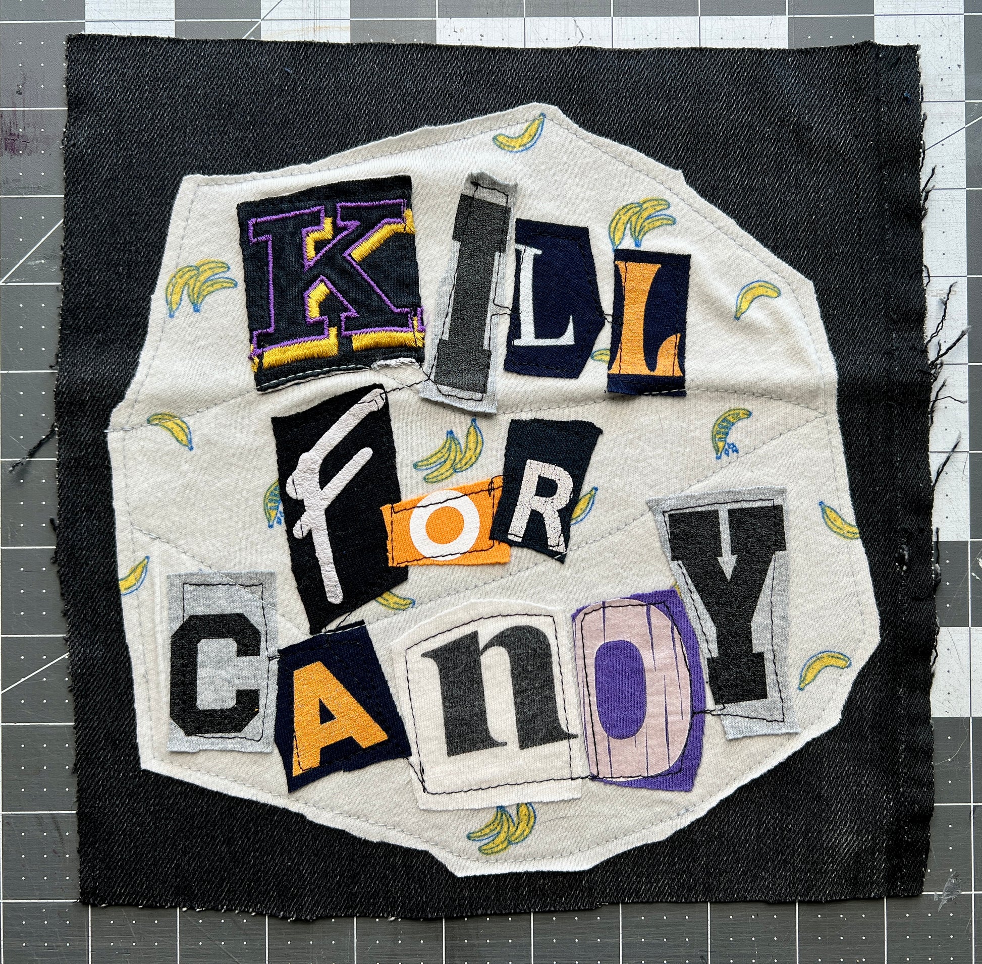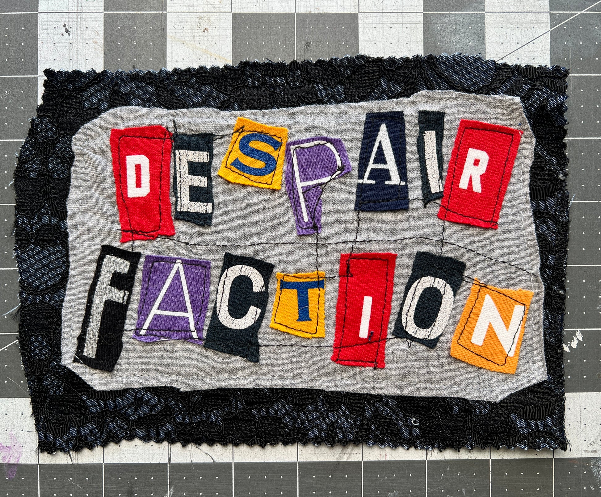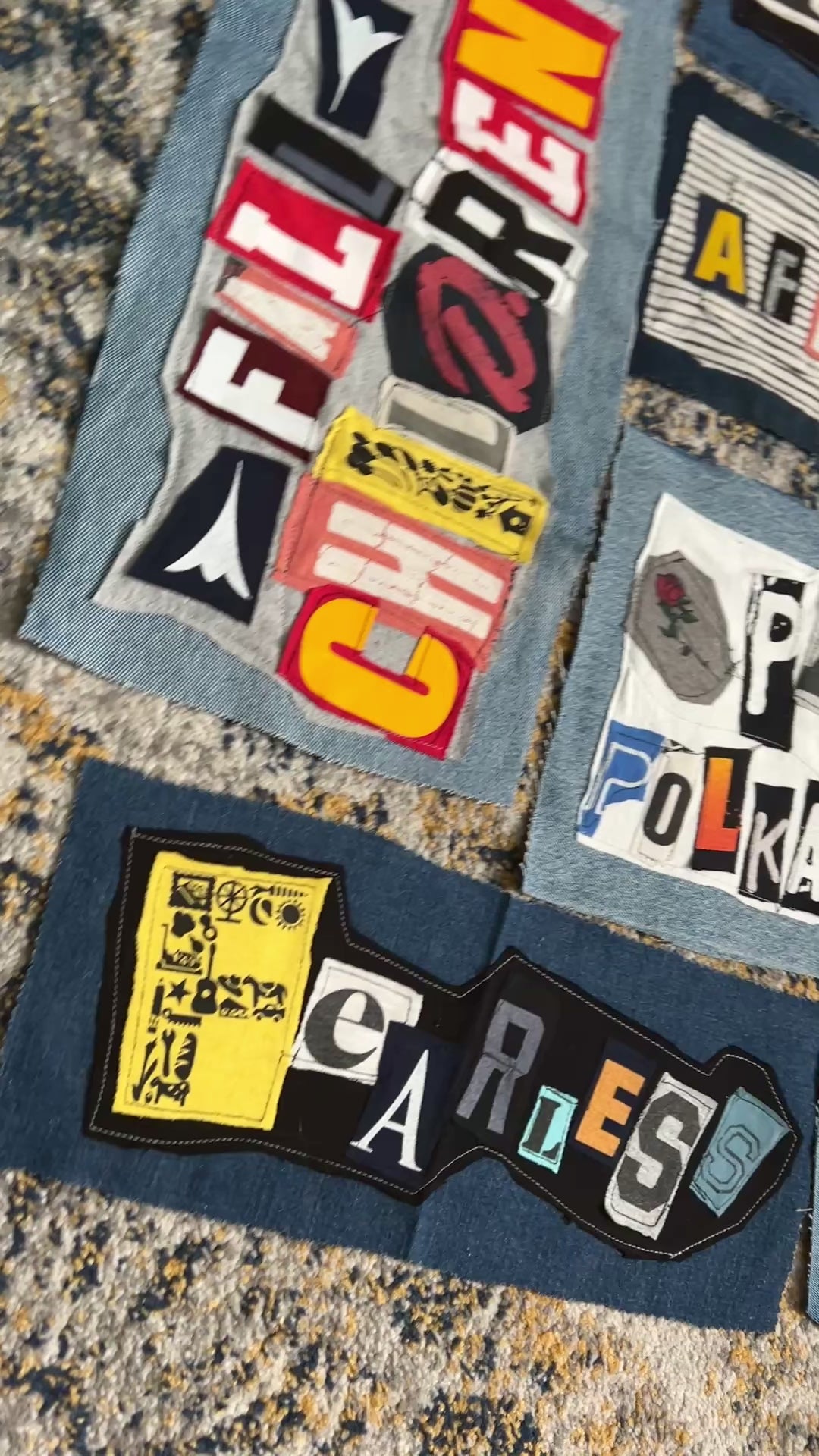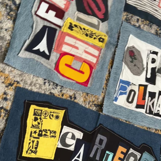 This is a unique DIY punk patch, upcycled from denim scraps and tshirt, with a custom design on the front of letters from various shirts in a random ransom note design. Durable patches, easy to sew onto jackets, pants, bags, etc. Panic in Polkadots, Taylor Swift, Blaqk Audio, Dreamcar, and AFI are the inspiration, with many more to come!