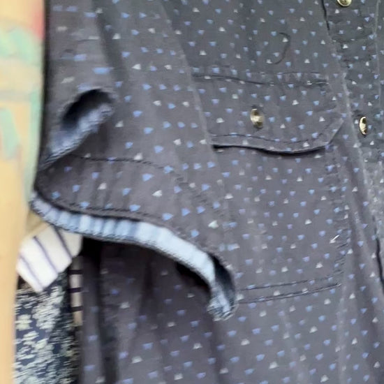 This is a one of a kind dress created out of a reclaimed button-up shirt and patchwork fabrics. This dress includes pockets, and its relaxed fit design will fit a range of sizes. This dress contains hidden pockets on the sides of skirt. Sustainable fashion looks good on everybody! Feel good knowing that you are not supporting fast fashion, which contributes to pollution and plastic production:
