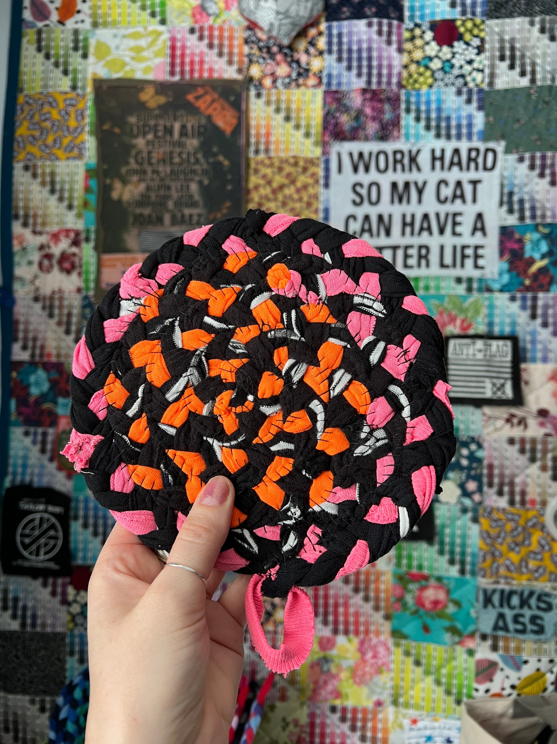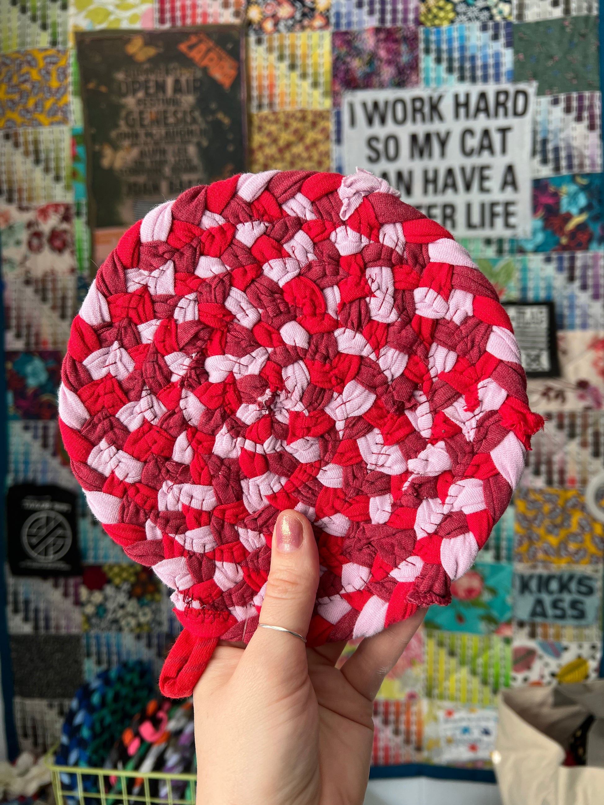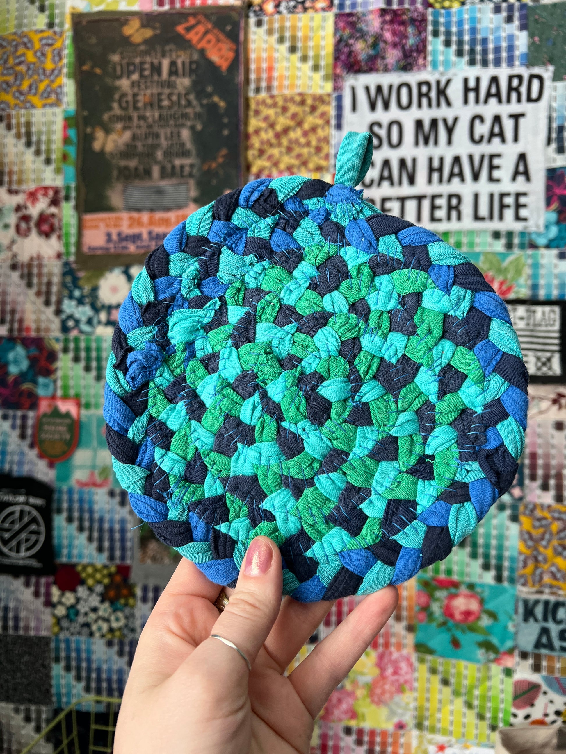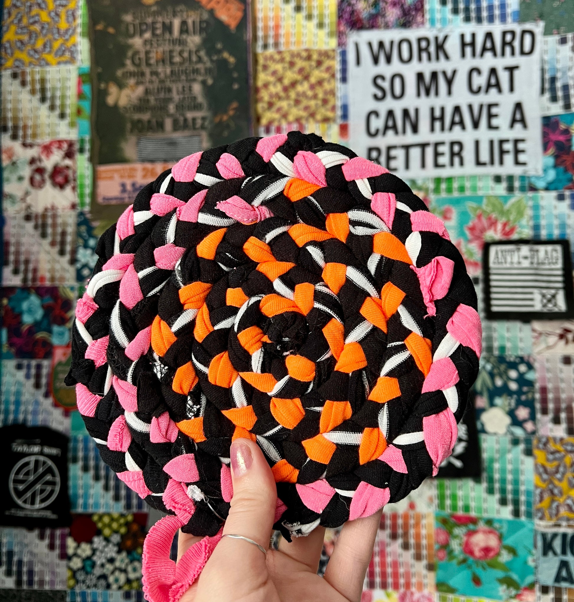These items are one-of-a-kind and handwoven with care, measuring approximately 7 1/2" inches in diameter. A loop has been sewn-in to provide for easy hanging storage. I braid strands of t-shirt together and then hand-sew it into a spiral, creating a design like no other. Throw into the washer with the rest of your laundry, and lay flat to dry, or tumble dry low.