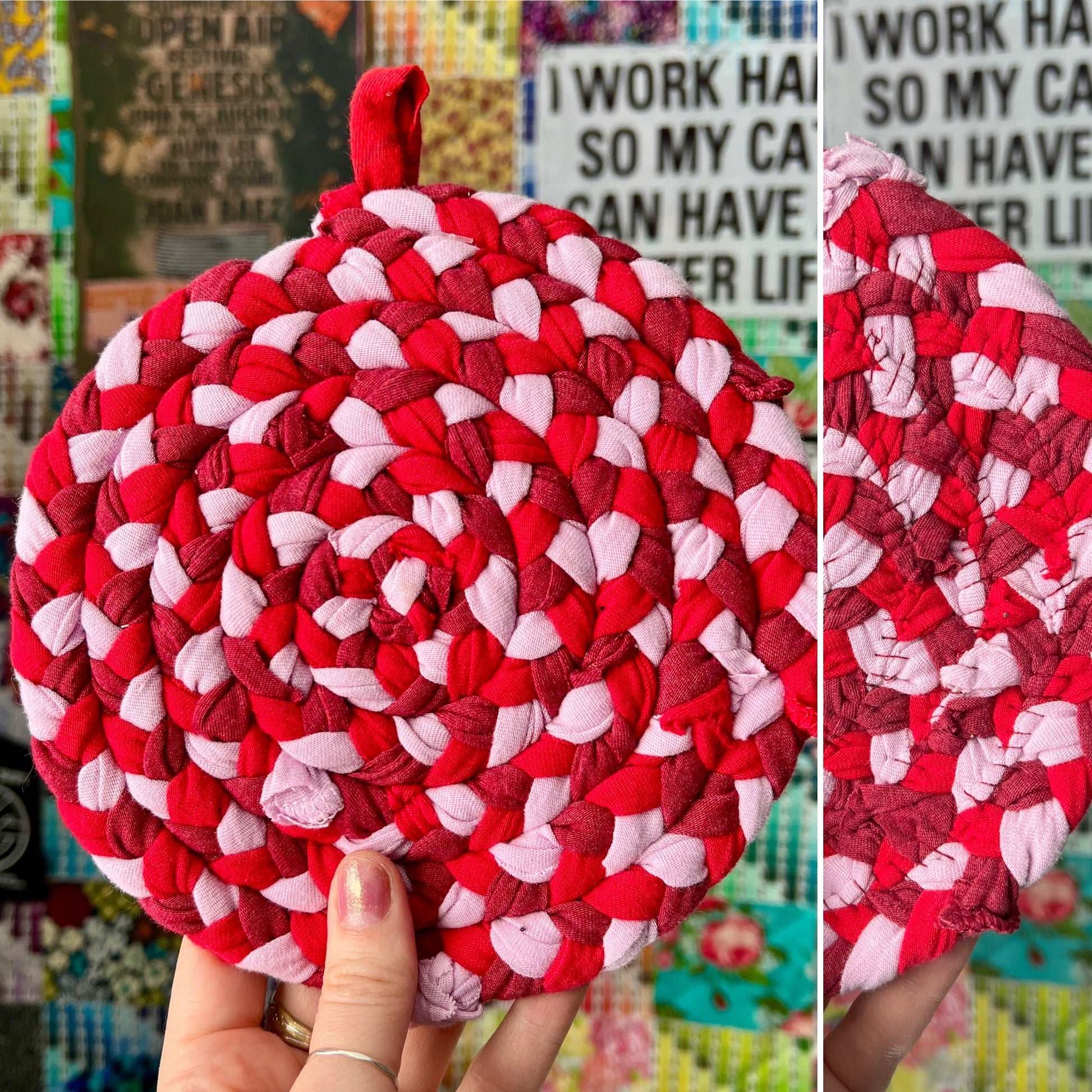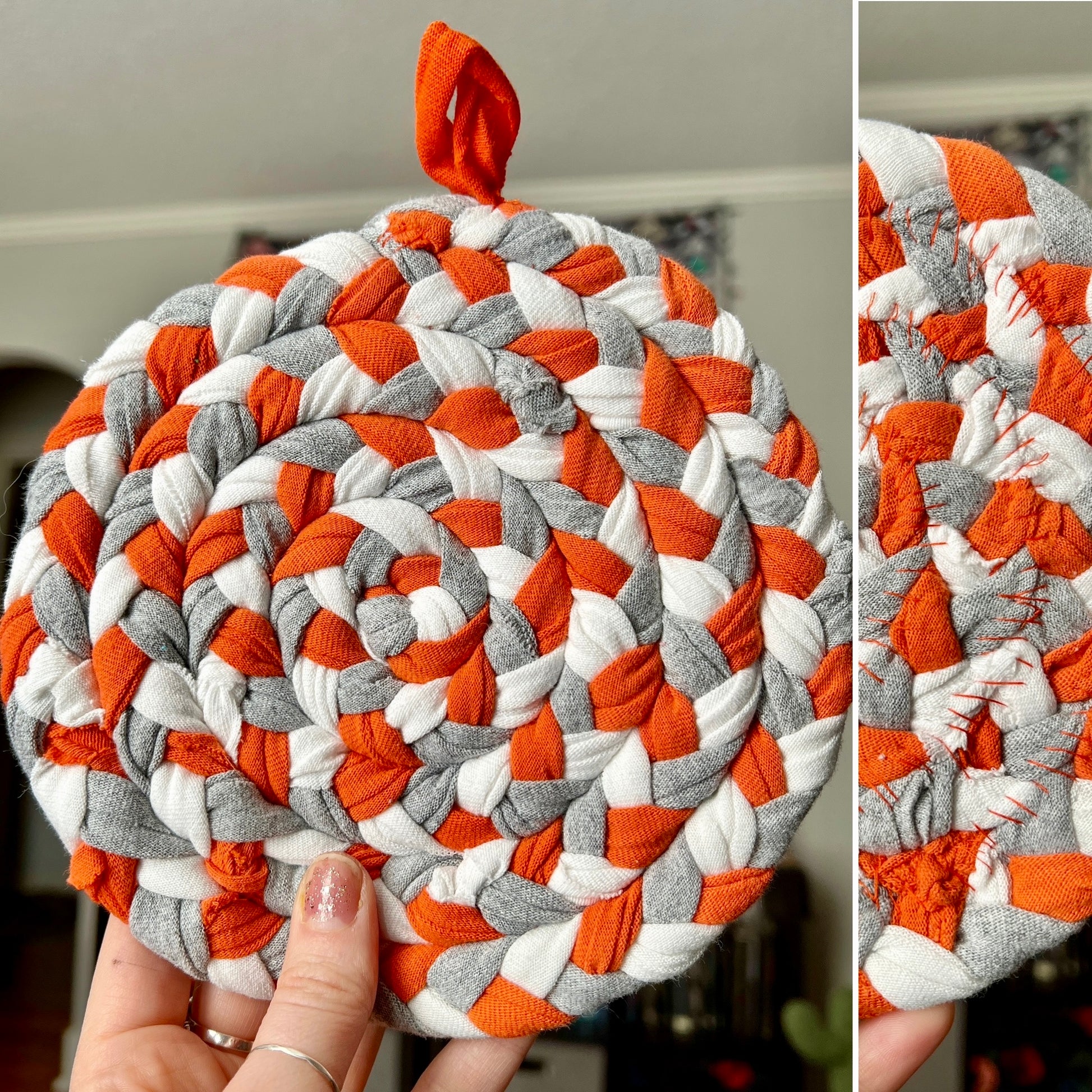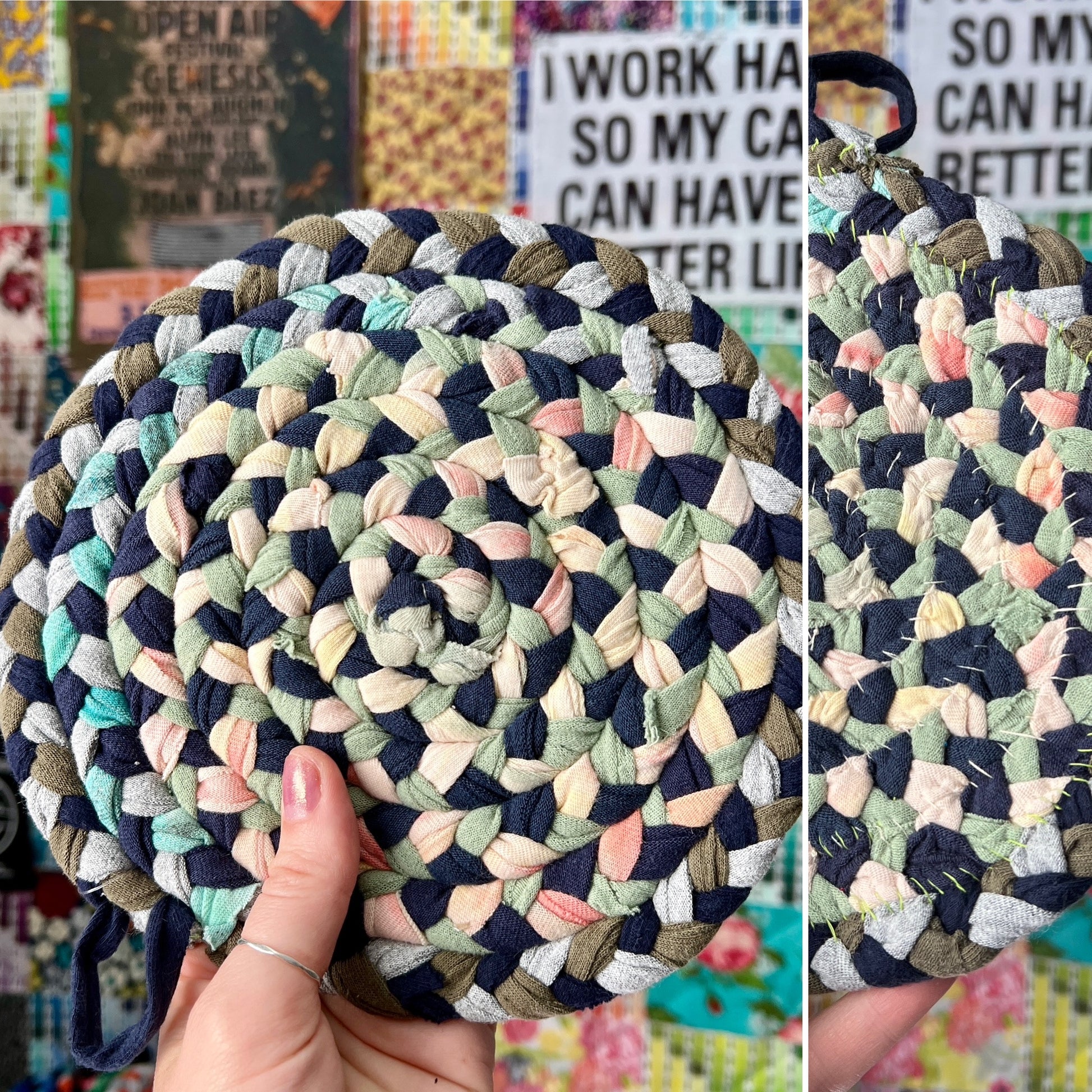 These items are one-of-a-kind and handwoven with care, measuring approximately 7 1/2" inches in diameter. A loop has been sewn-in to provide for easy hanging storage. I braid strands of t-shirt together and then hand-sew it into a spiral, creating a design like no other. Throw into the washer with the rest of your laundry, and lay flat to dry, or tumble dry low.
