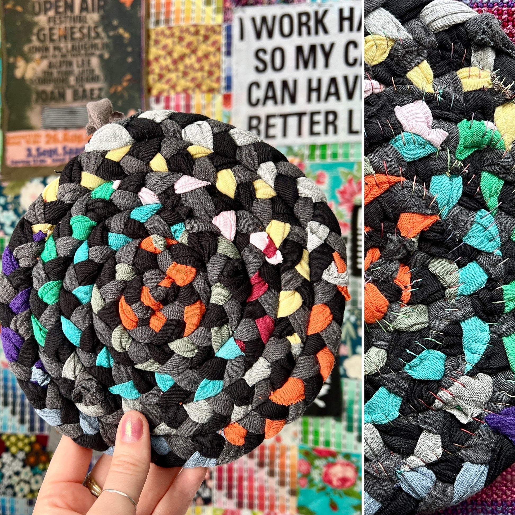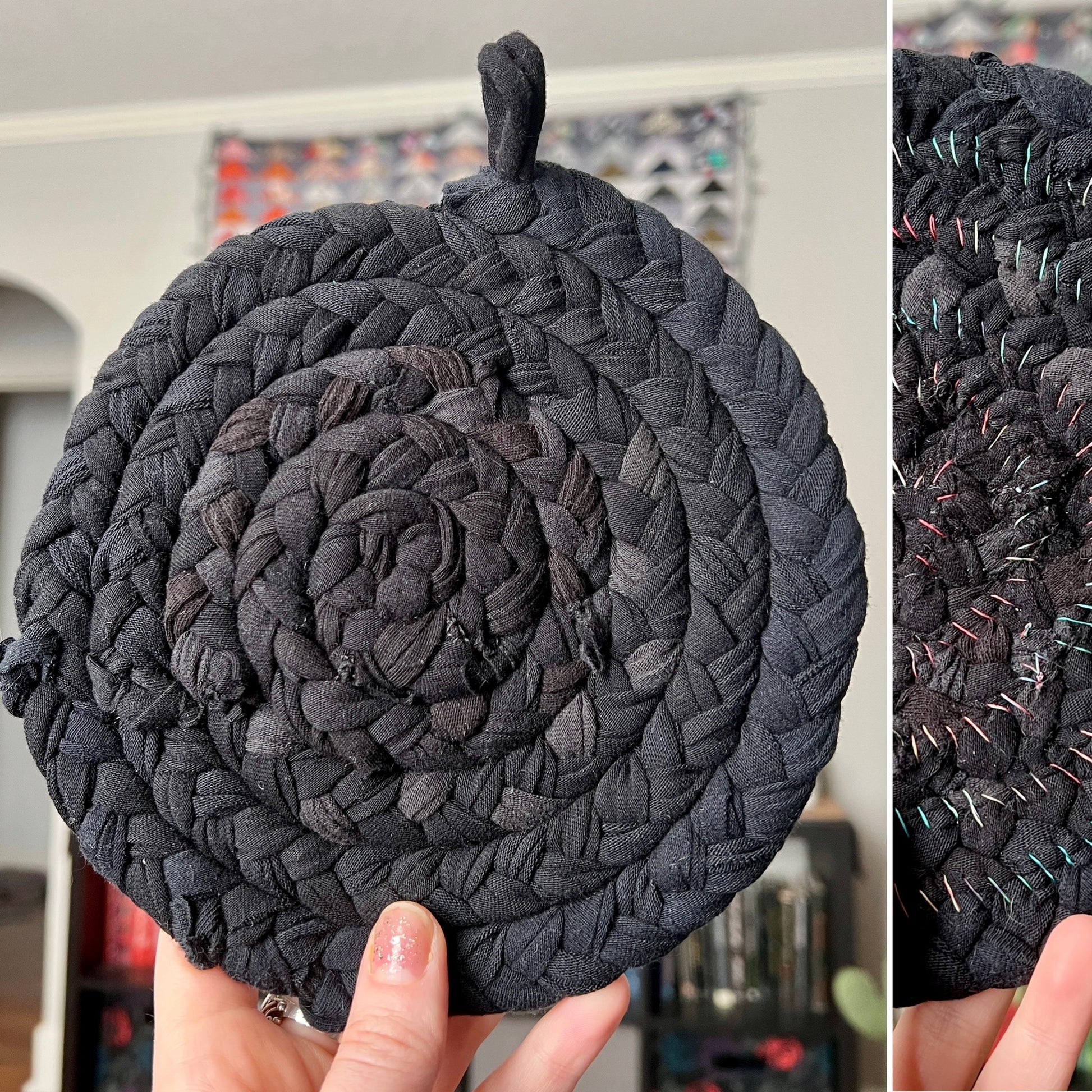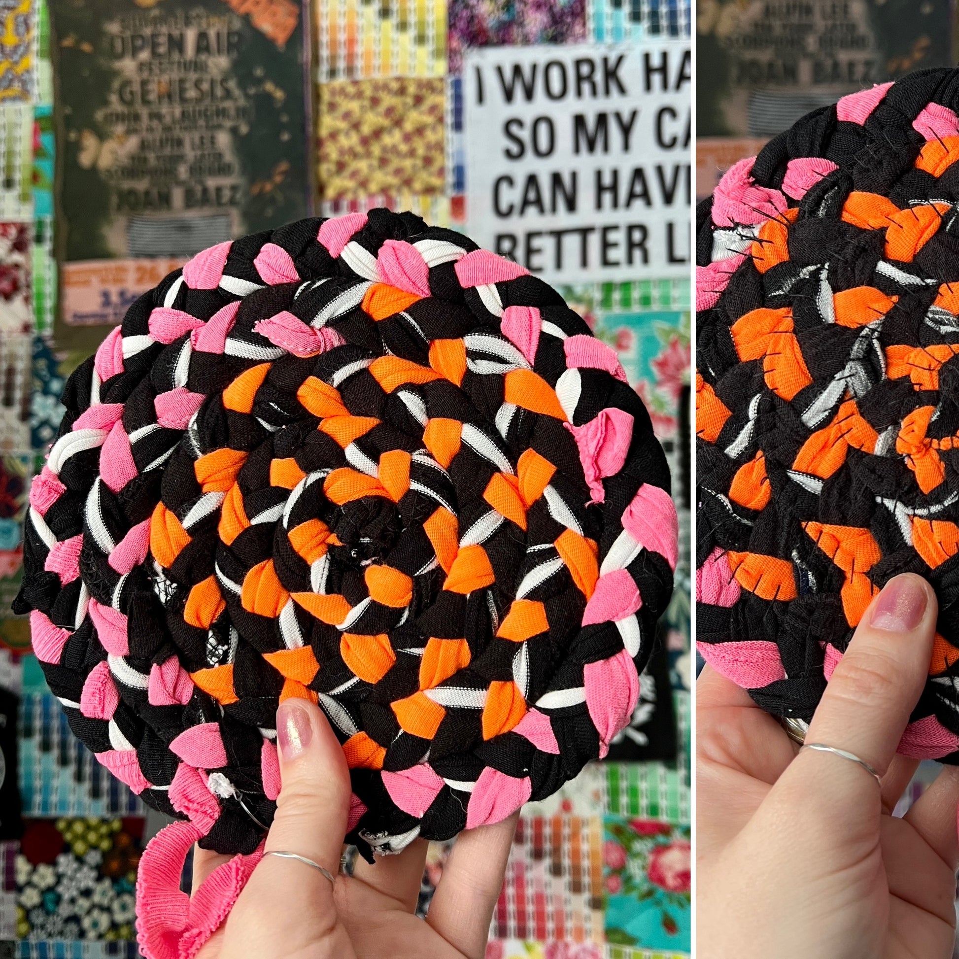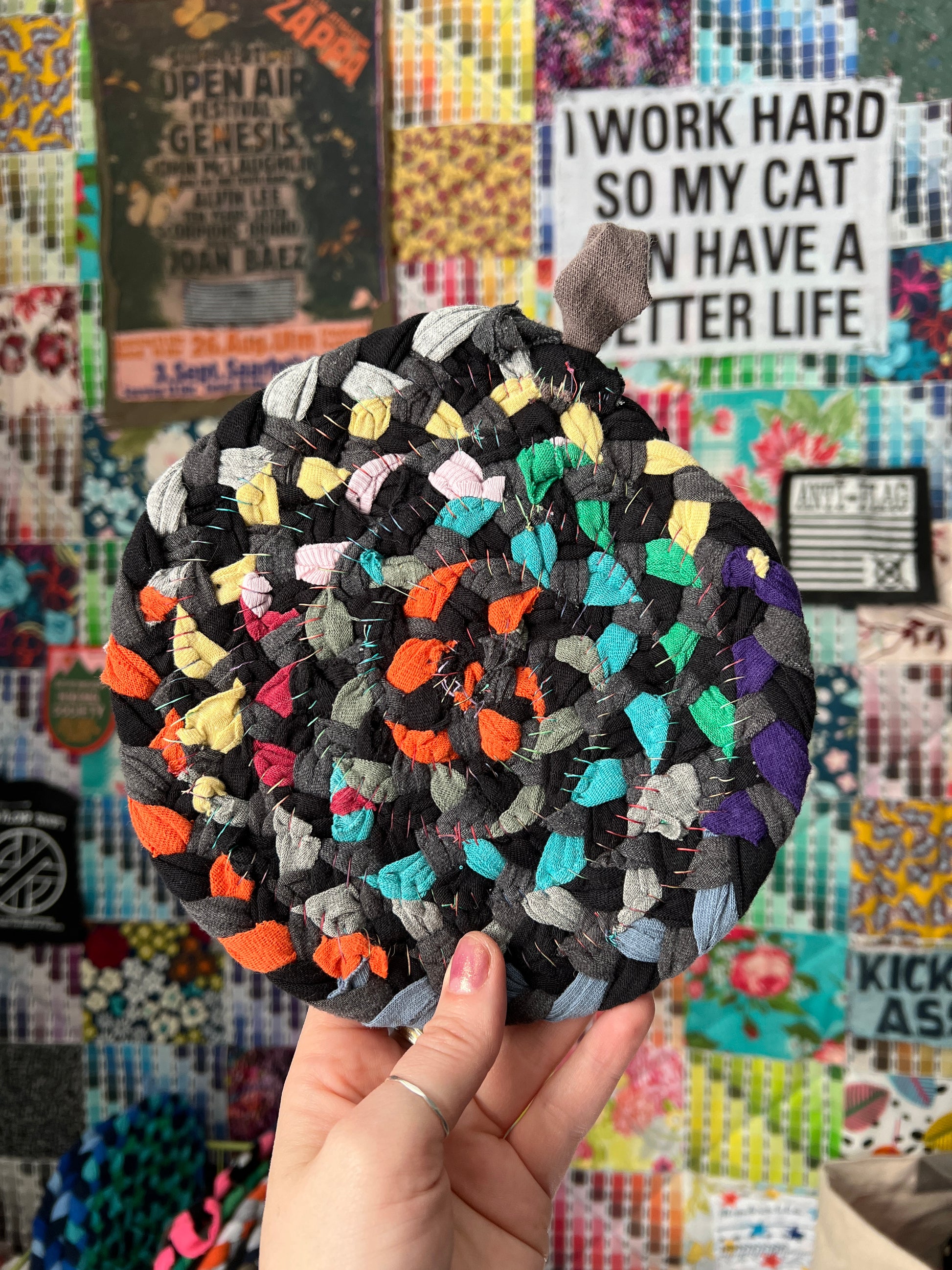 These items are one-of-a-kind and handwoven with care, measuring approximately 7 1/2" inches in diameter. A loop has been sewn-in to provide for easy hanging storage. I braid strands of t-shirt together and then hand-sew it into a spiral, creating a design like no other. Throw into the washer with the rest of your laundry, and lay flat to dry, or tumble dry low.