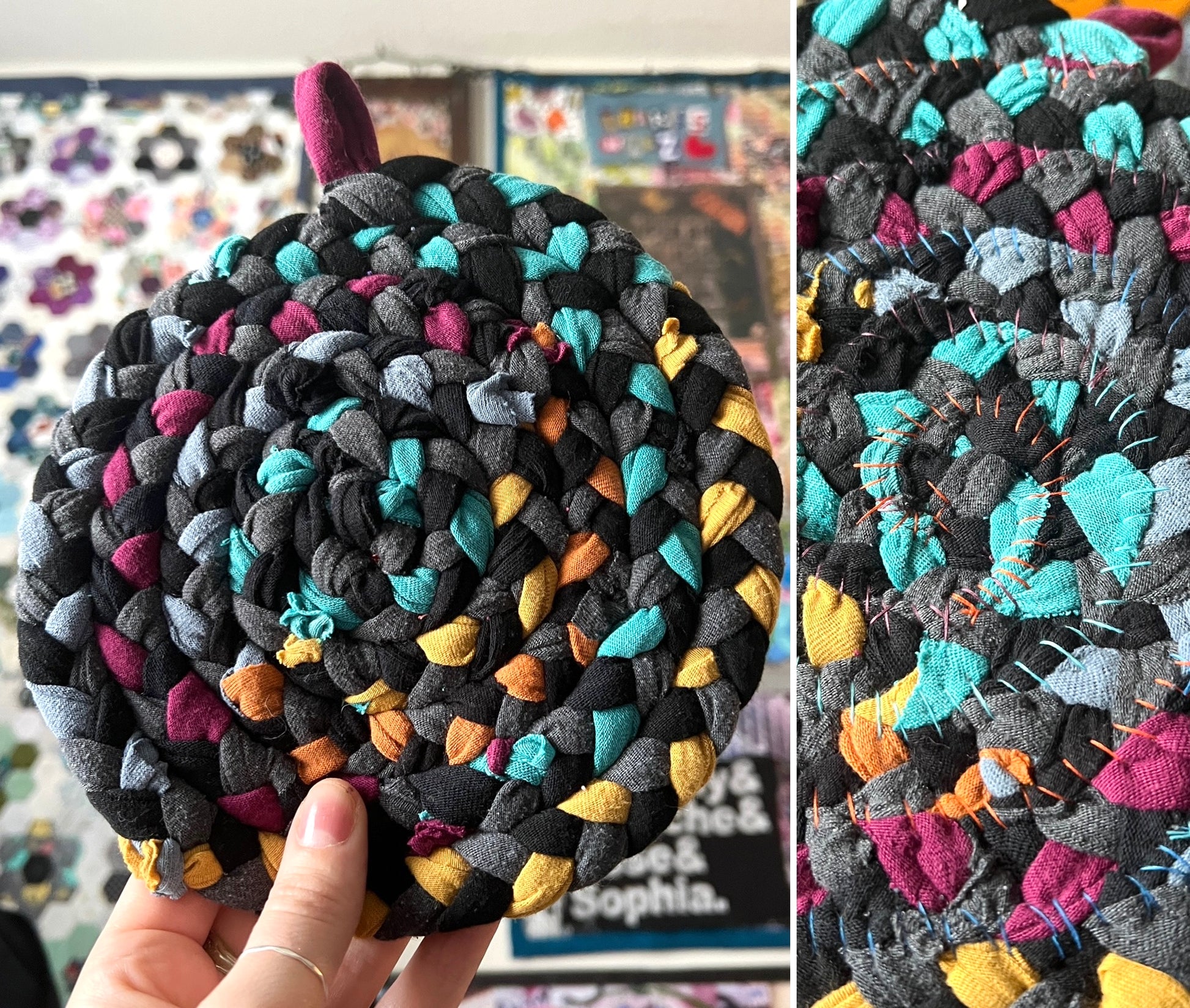 Single trivet/potholder which have been created out of t-shirts! I make custom t-shirt quilts for customers using the graphics from the shirt and end up with a lot of t-shirt fabric left over. Rather than add it to the trash and landfills, I decided to give the t-shirt scraps new life as an awesome mandala trivet or potholder!