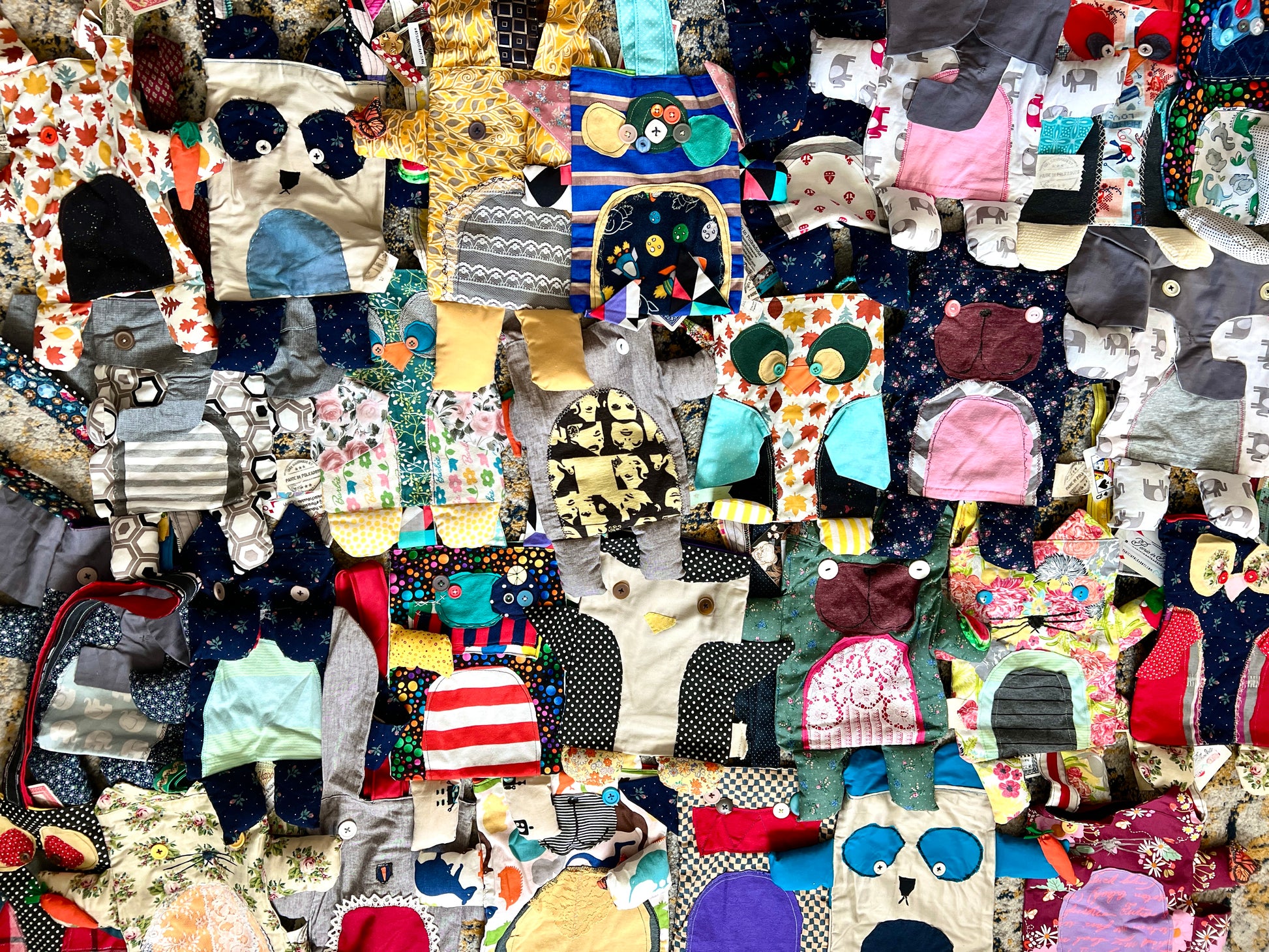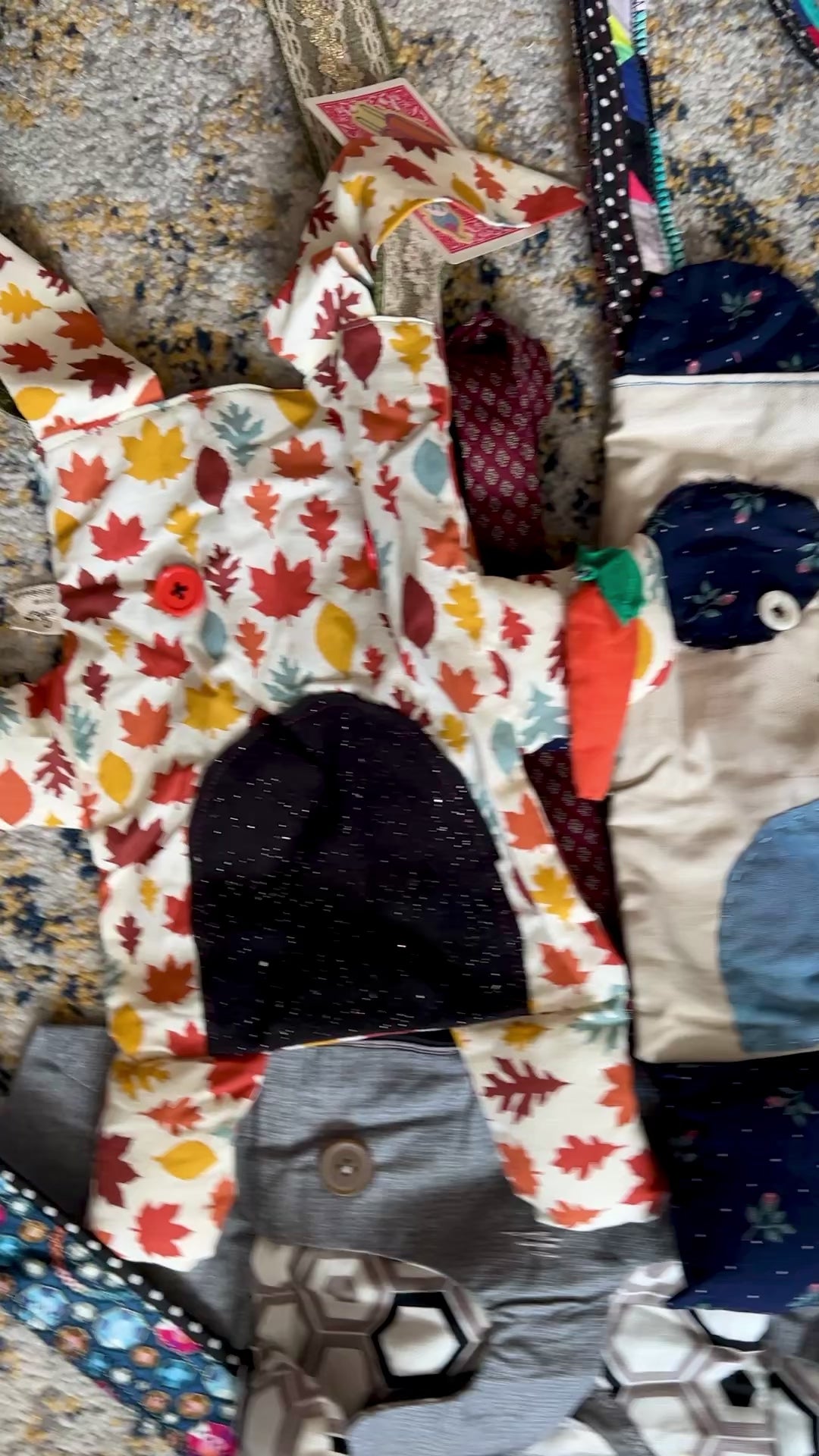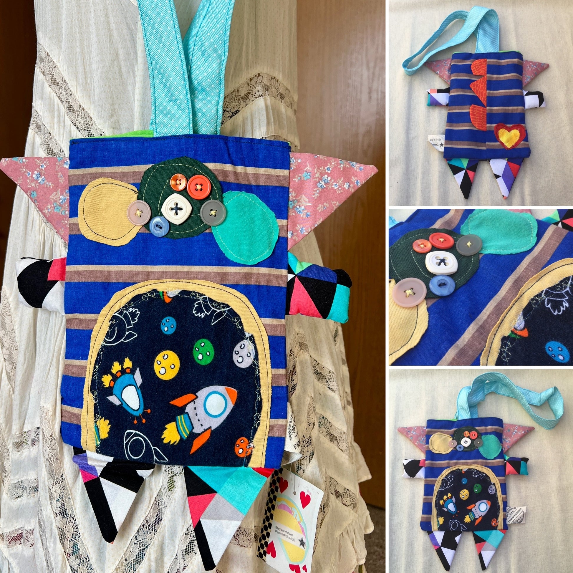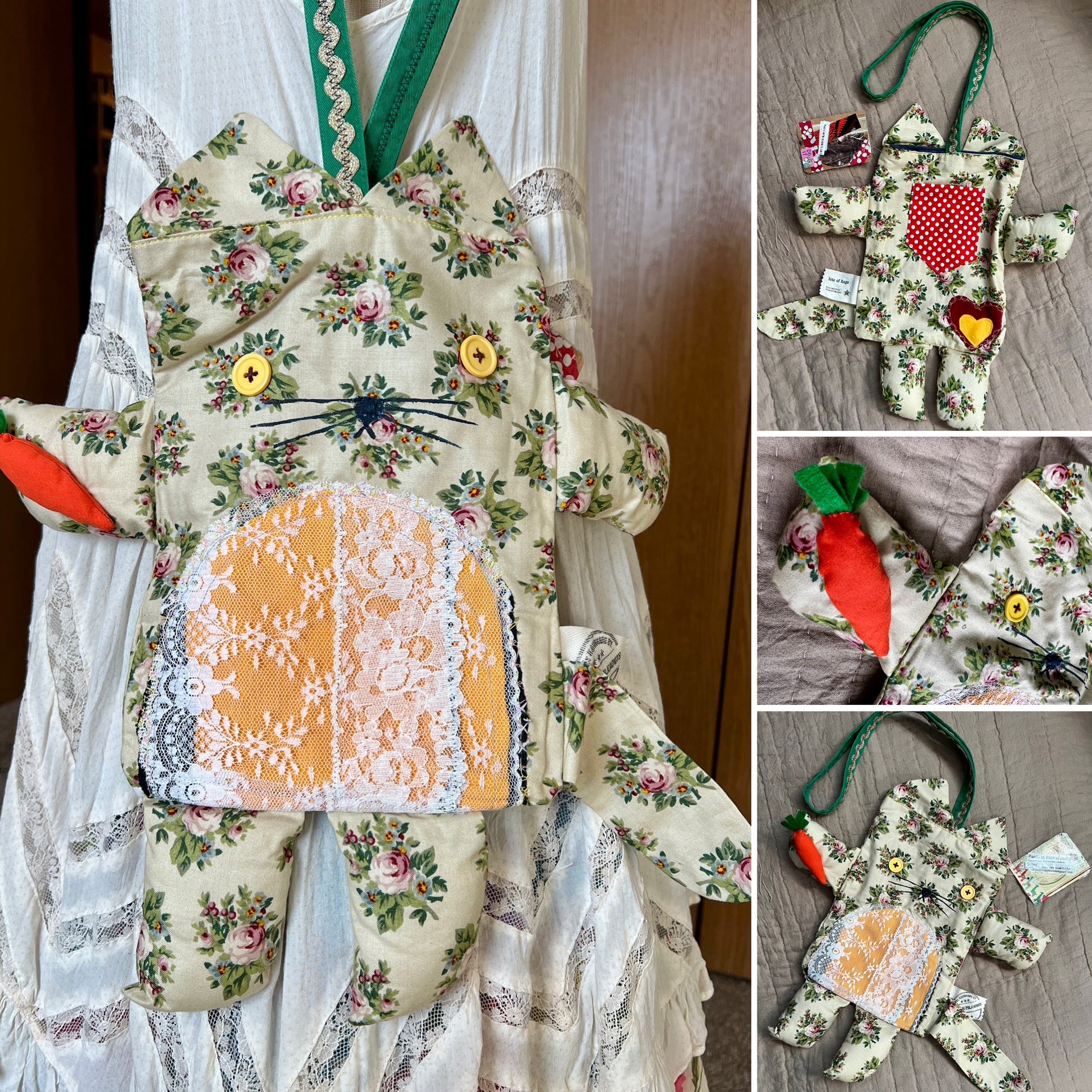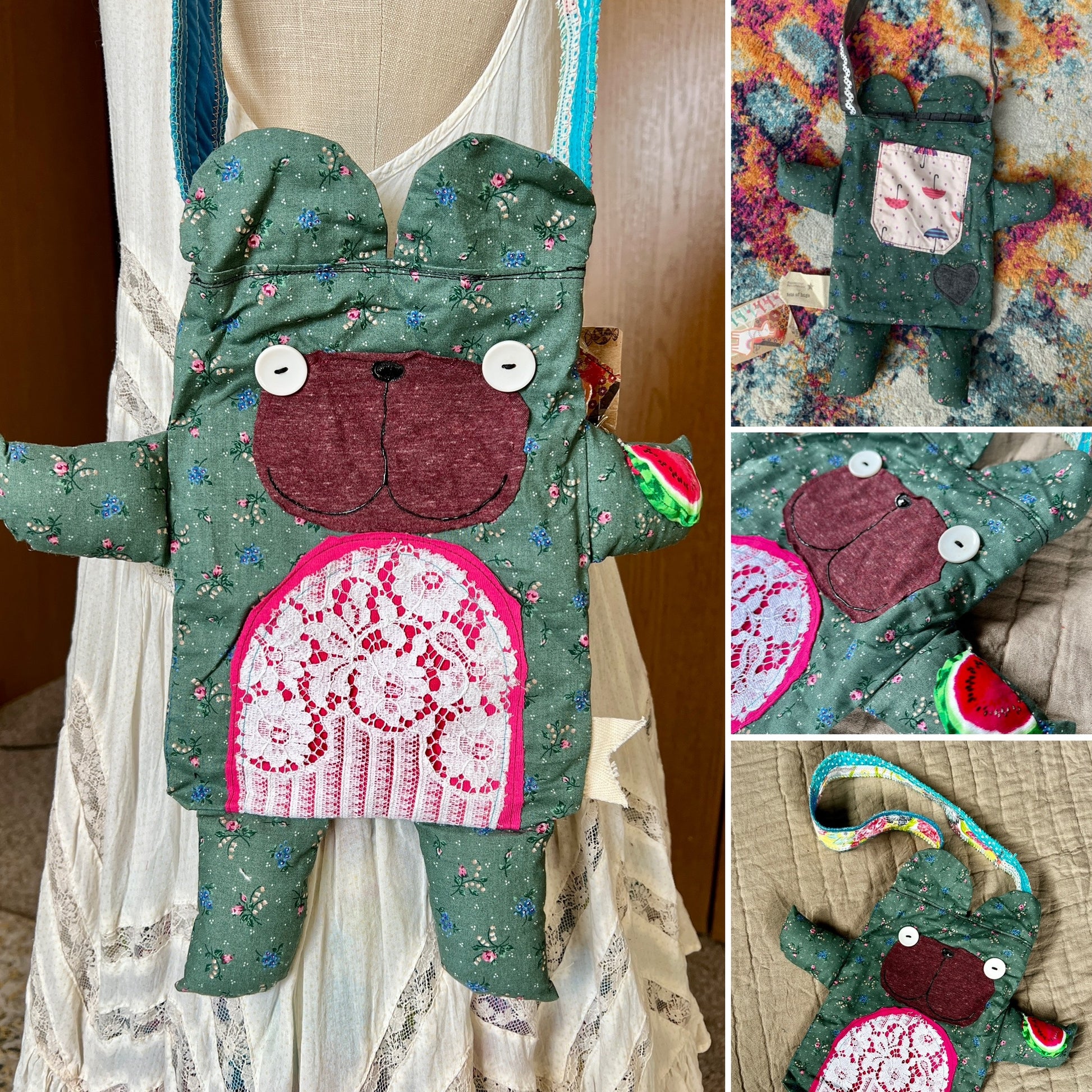 Each large tote body is approximately 8 by 10 inches which does not include the arms, legs, or ears. Small satchel body measures approximately 6 by 8 inches. The strap is fashioned from an upcycled necktie or apron strap measuring anywhere from 24-30 inches long. They are all unique, if you'd like specific measurements, let me know. The inner lining is a coordinating soft tshirt fabric.
