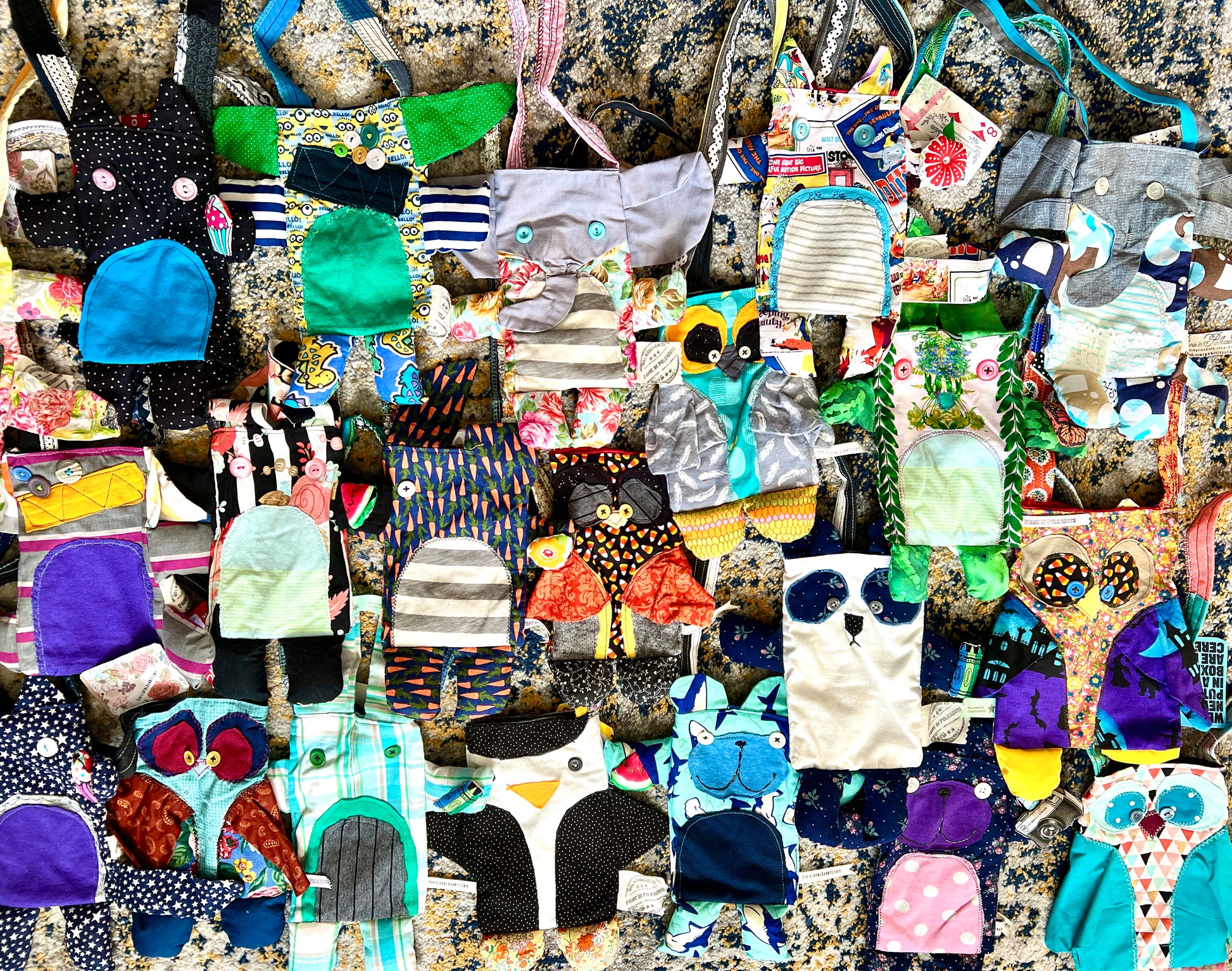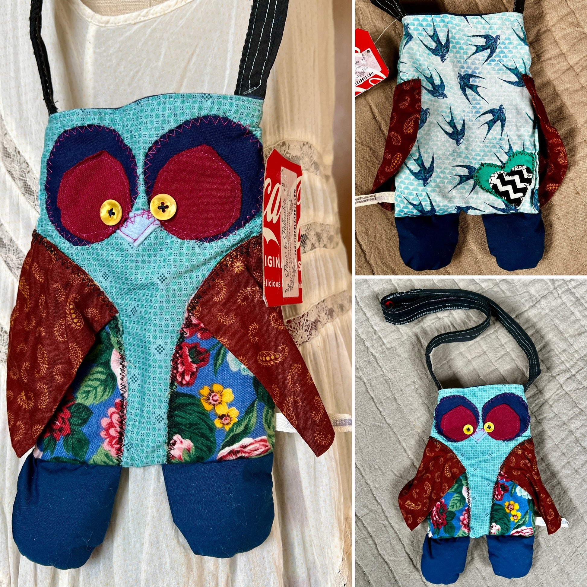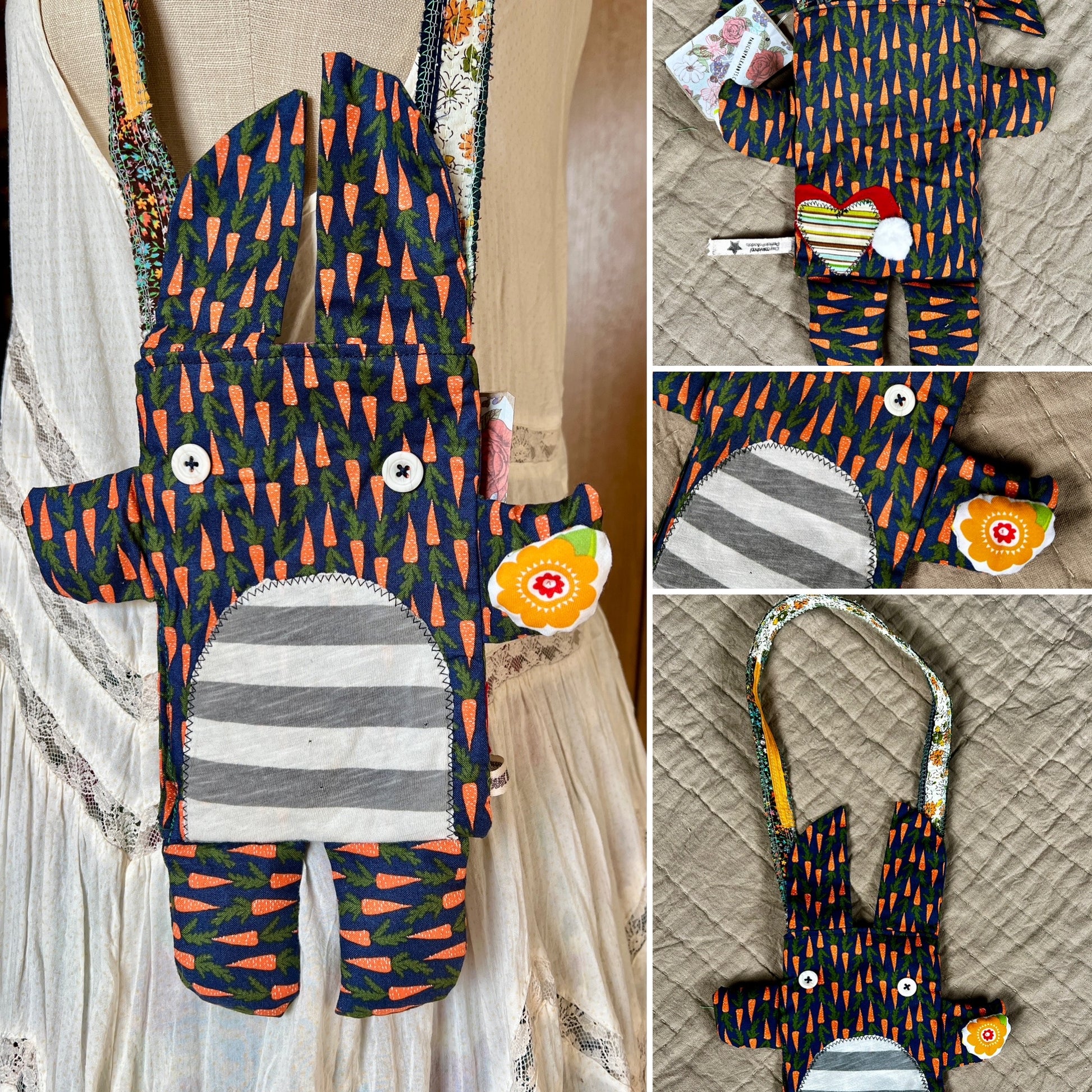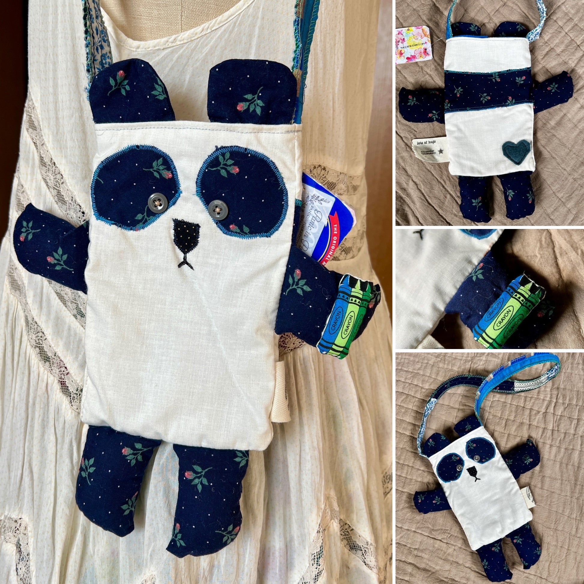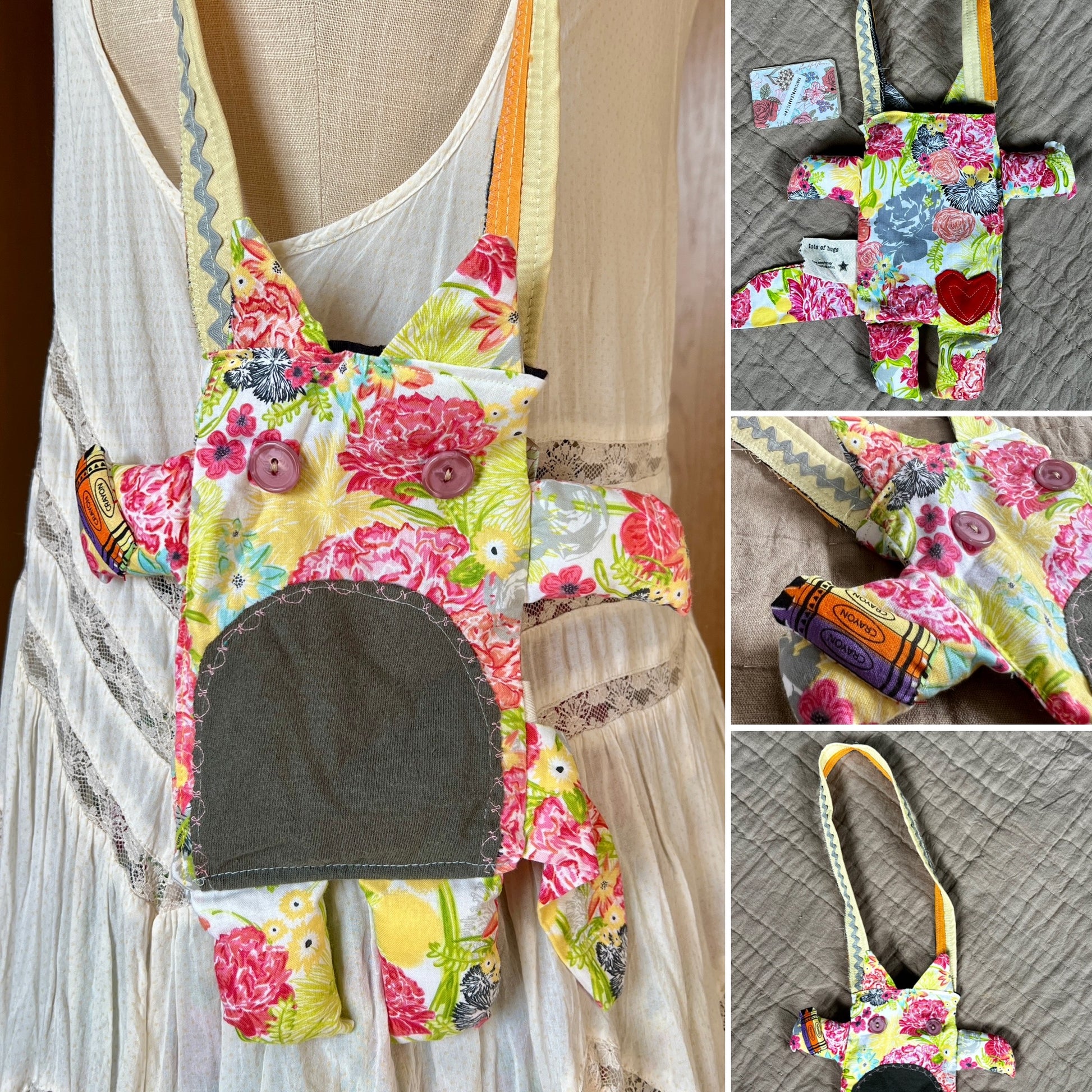 Small satchel body measures approximately 6 by 8 inches, which does not include the arms, legs, or ears. The strap is fashioned from an upcycled necktie, fabric scraps, or an apron strap measuring anywhere from 24-30 inches long. They are all unique, if you'd like specific measurements, let me know. The inner lining is a coordinating soft tshirt fabric.