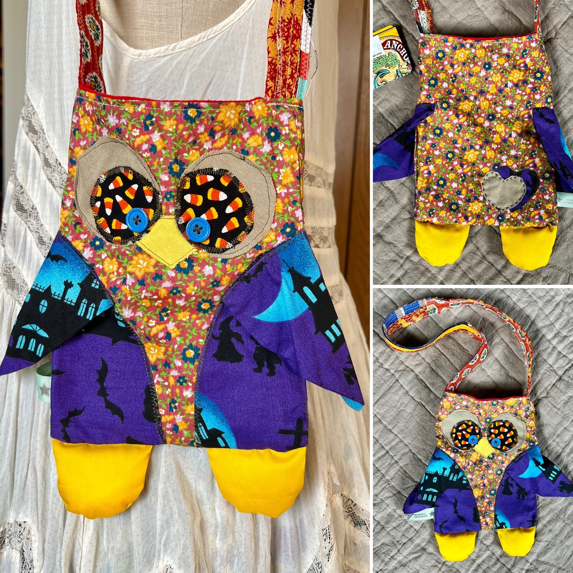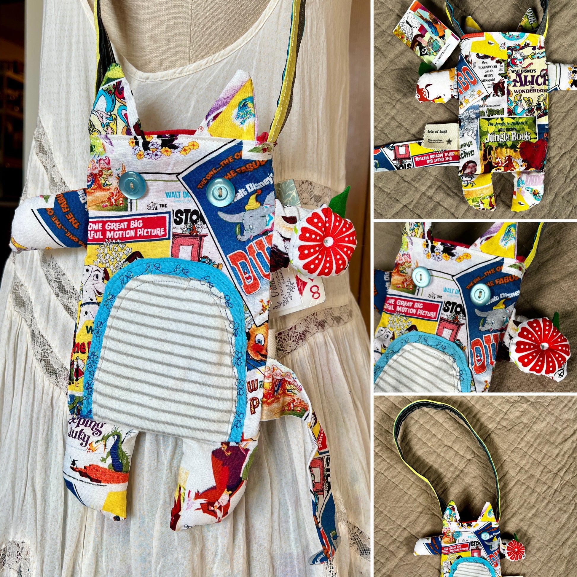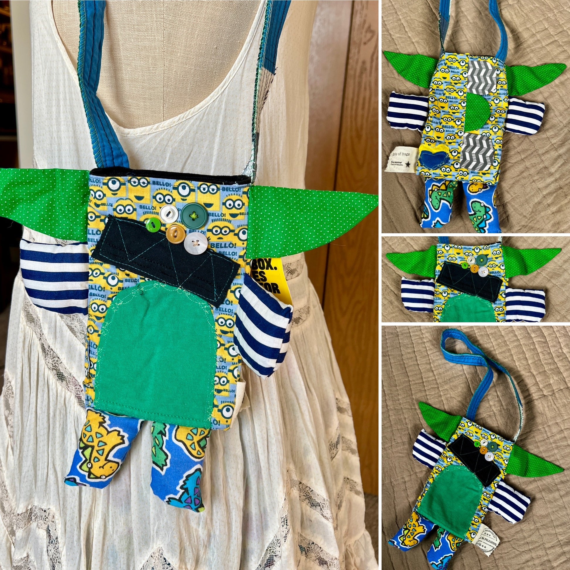 This is a one-of-a-kind tote bag in the style of a monster or animal friend, guaranteed to hold your stuff in the cutest way possible! It has been hand-crafted from a mix of new and vintage materials, creating a small tote bag or satchel that is unlike any other.