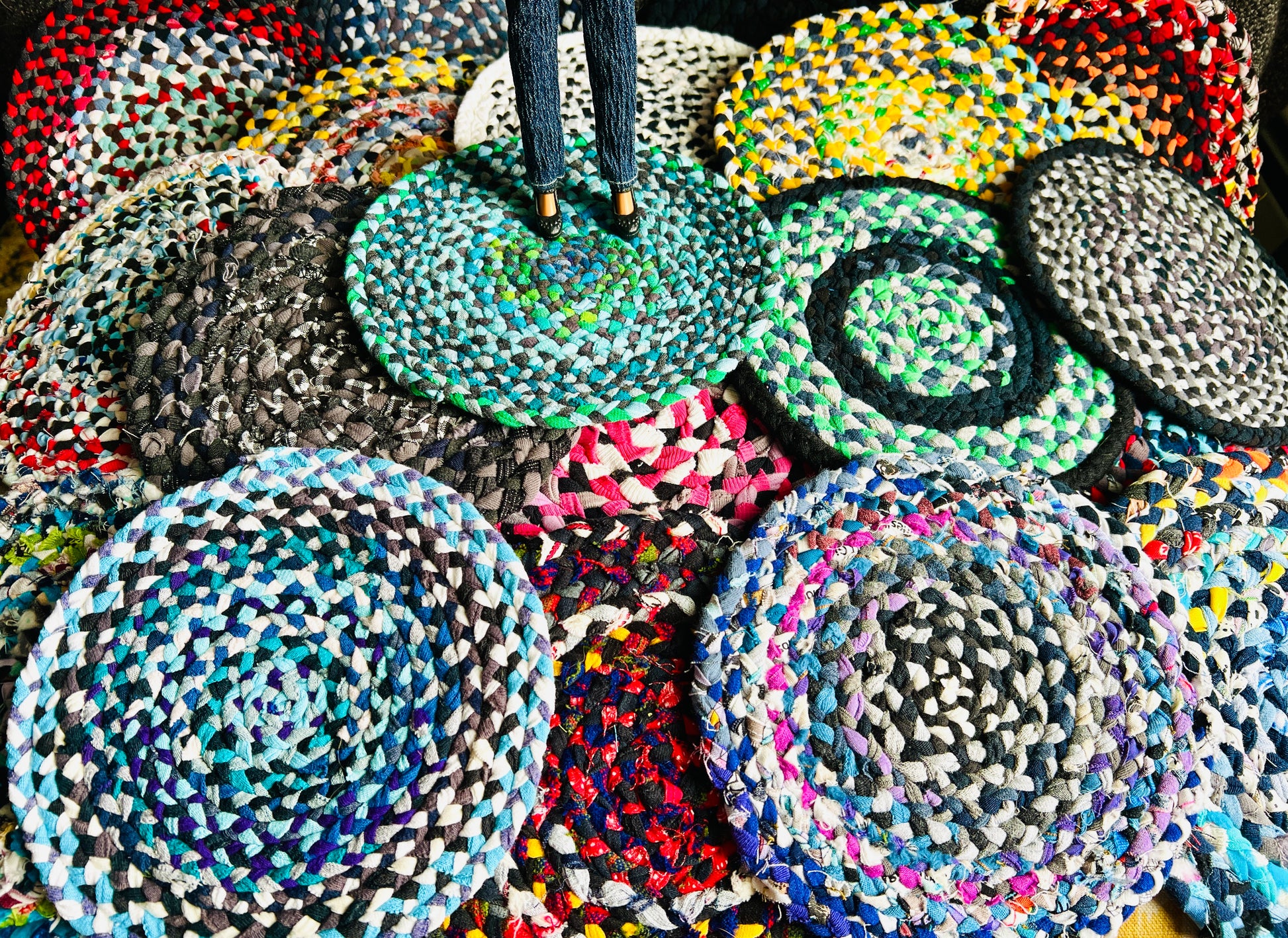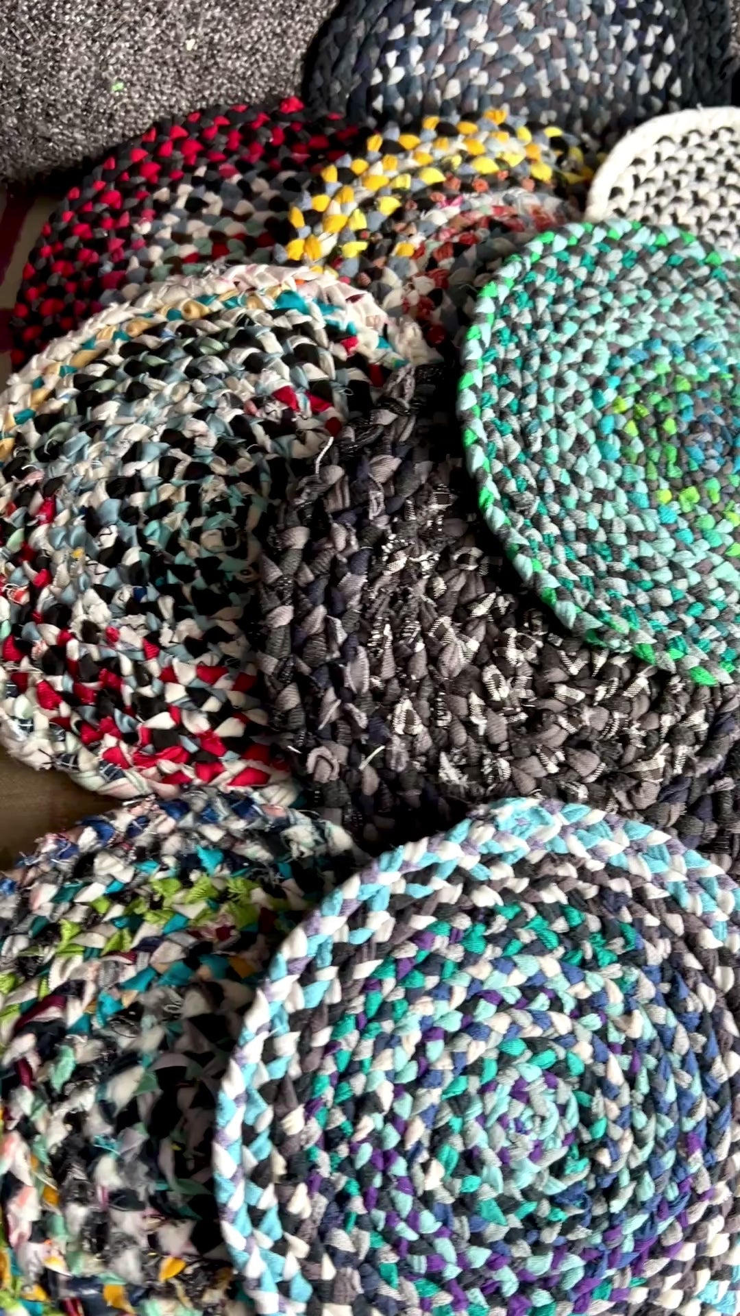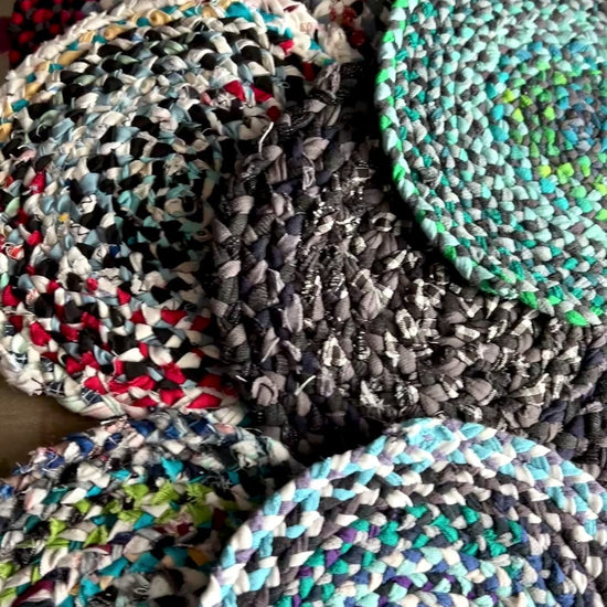 The square rugs are one-of-a-kind, handwoven and stitched with care. They measure approx 7 x 6 inches square, and can be machine washed and air dried. The cashmere round rugs, contain strips of real cashmere mixed with tshirt strips, and are 7 1/2 inches in diameter. Oval rug is 5 x 8 inches.