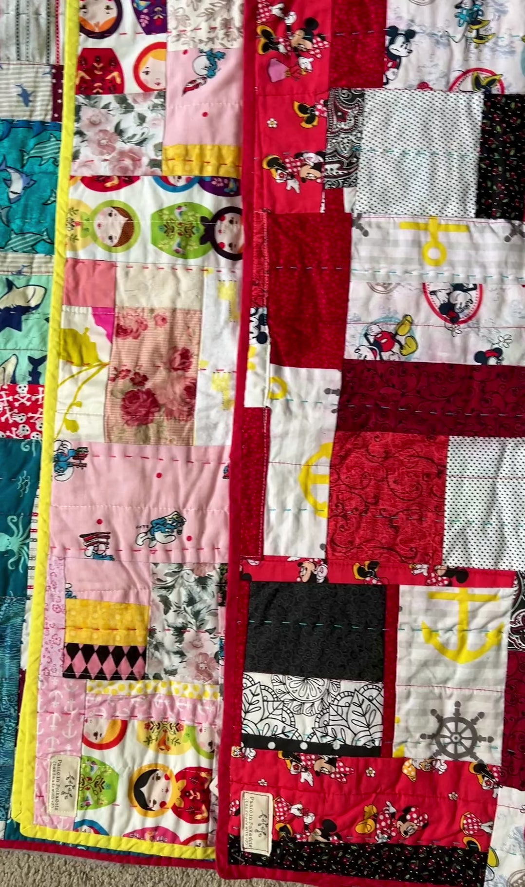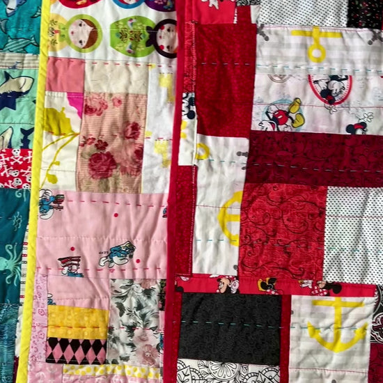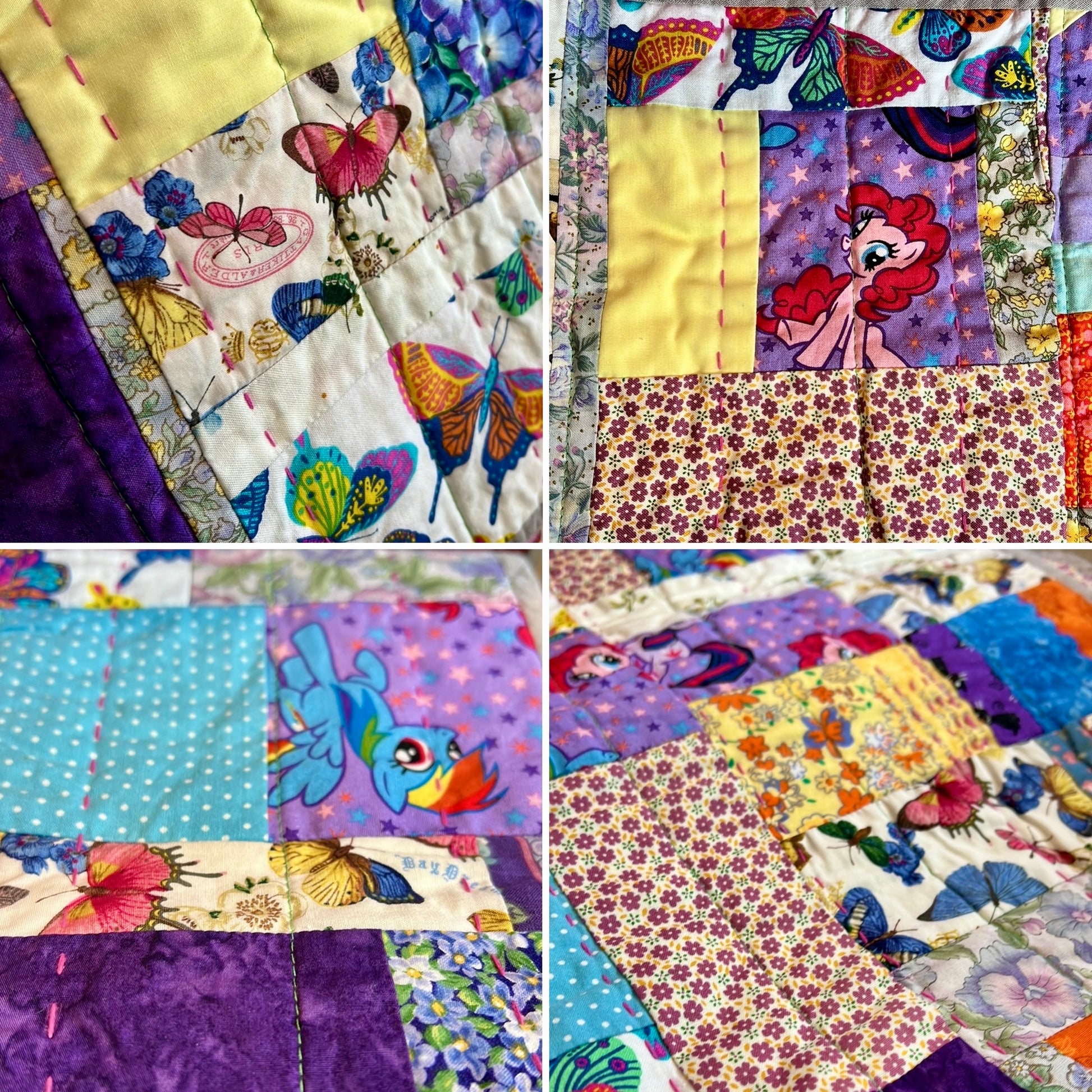 This is a listing for a one of a kind quilt featuring a scrappy selection of fun fabrics! Hand stitching detail in between rows of machine stitching for reinforcement. Bound with colorful bias tape, and backed with cotton. Some quilts are strips of fabric, bound with the backing fabric.